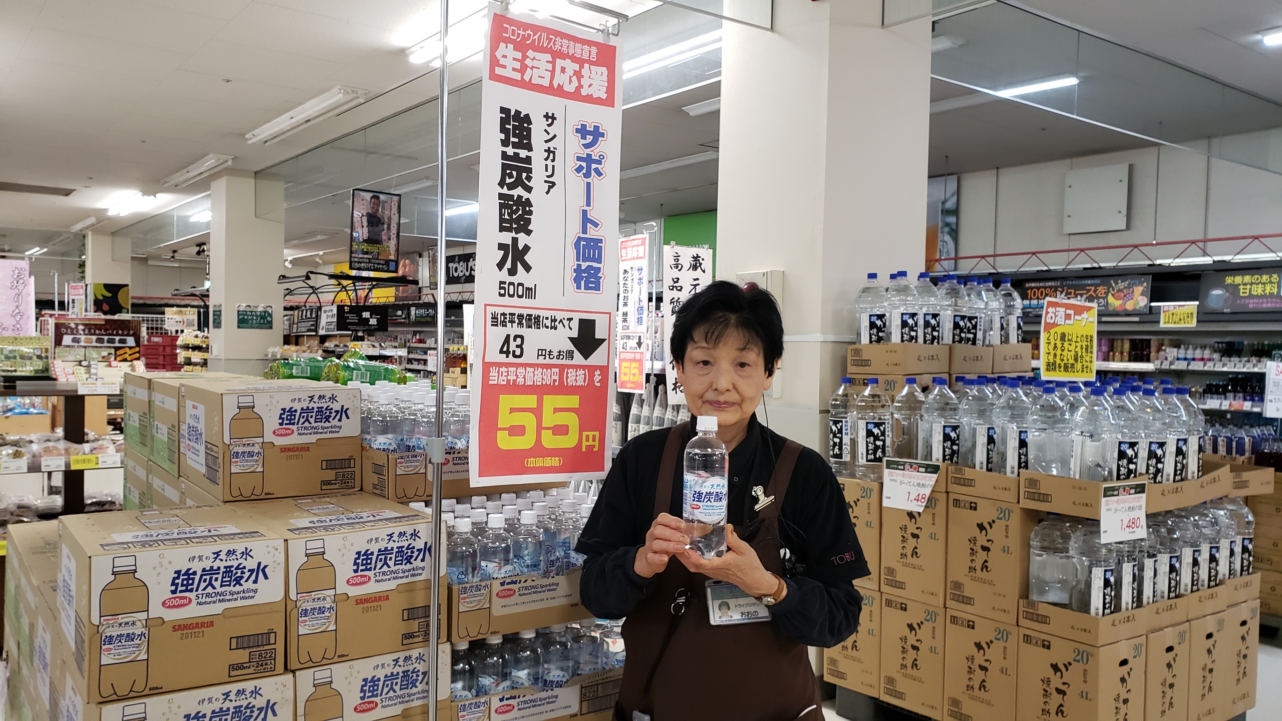 食品コーナーからは!サンガリア 強炭酸水です。伊賀の天然水を使用した強い刺激と クリアな爽快感です。価格は500ml入りで55円です。是非お買い求めくださいませ。