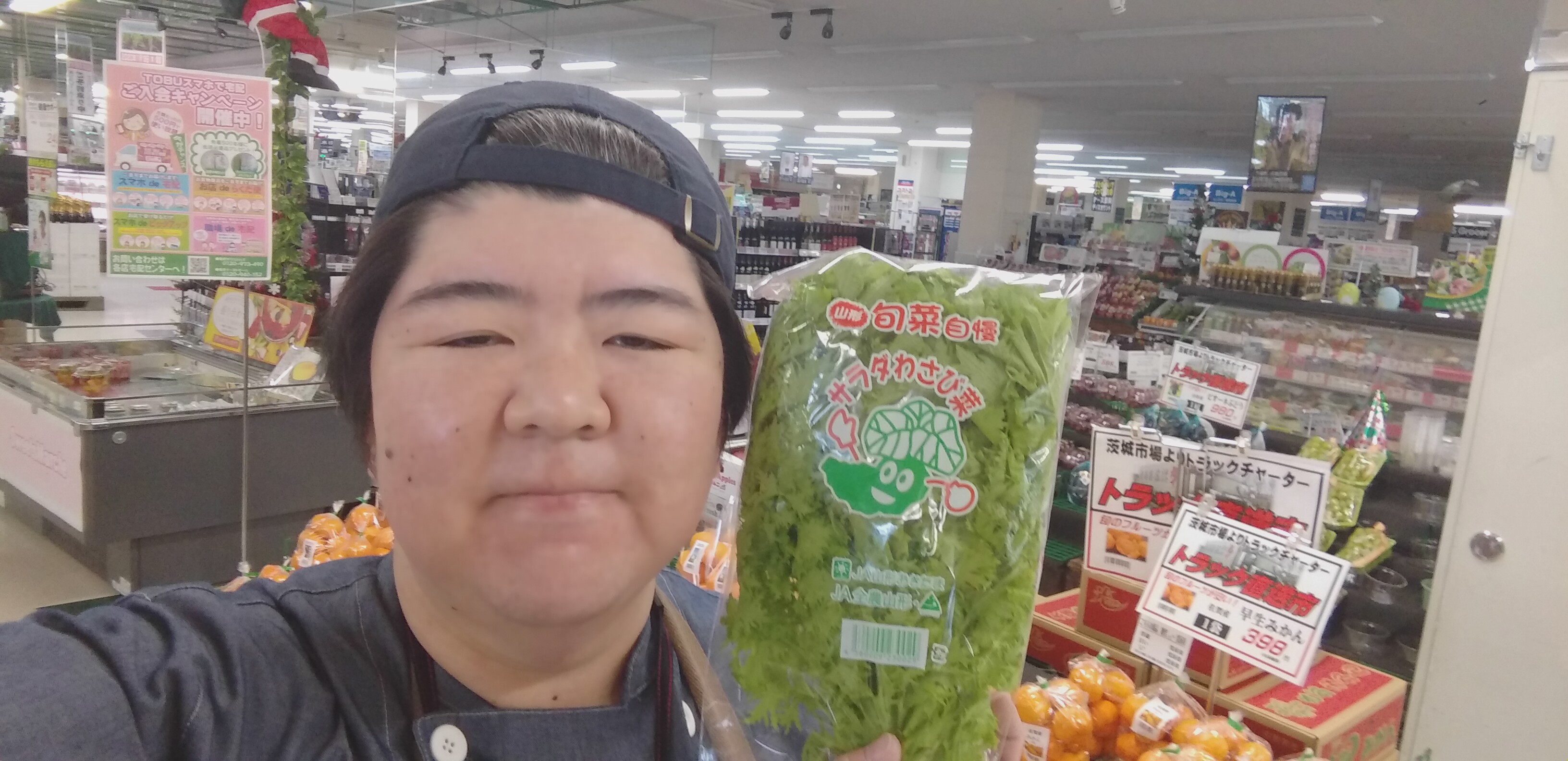 おはようございます。青果担当奥瀬です。本日からはスーパー大均一祭です。青果コーナーもお買い得品をご用意しております。例えば、山形産のわさび菜 1袋99円です。リーフレタスのようにサラダにも使えますし、ピリッとした辛さが浅漬けにも使えます。是非ご利用ください。