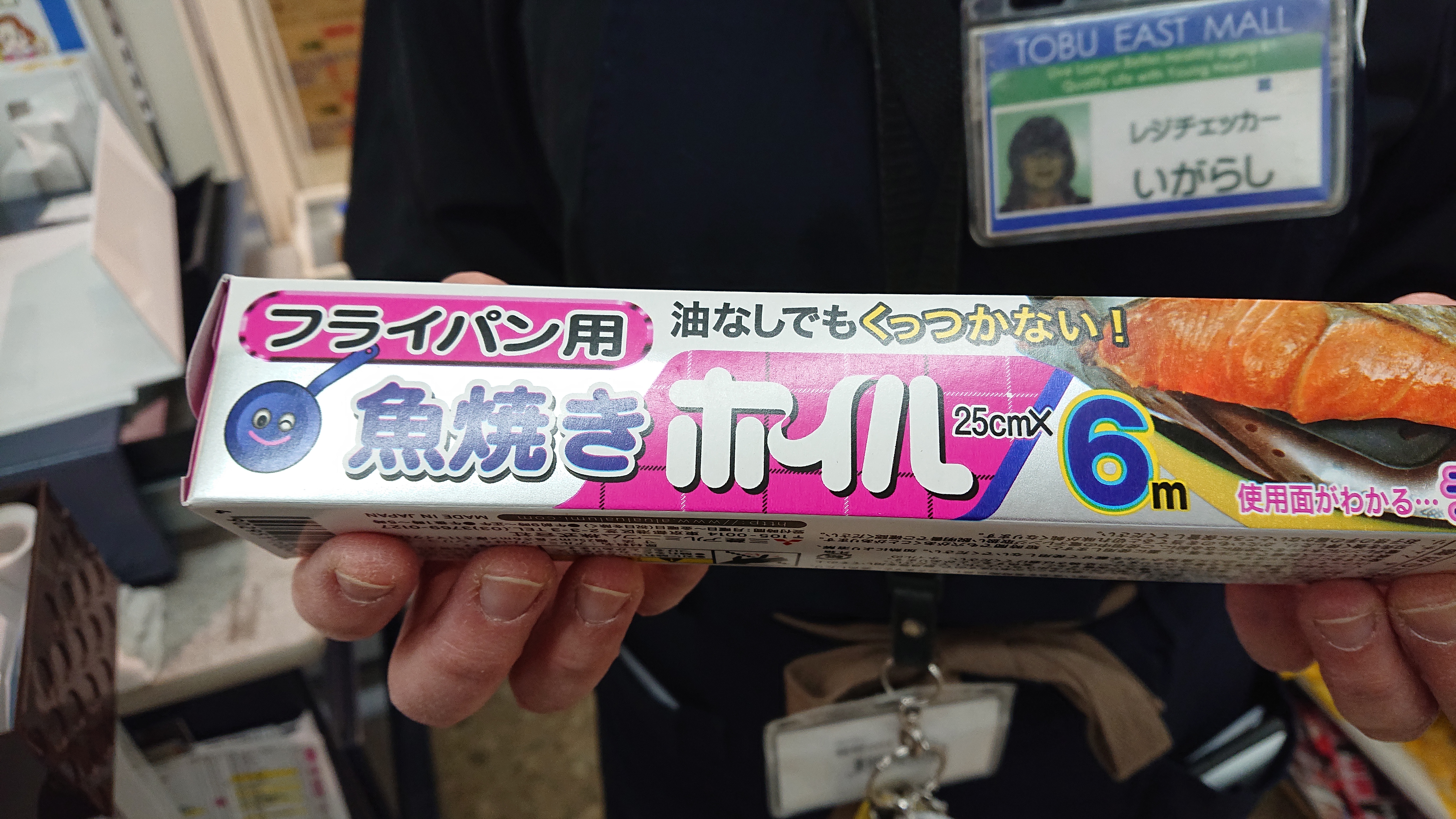 おはようございます。家庭消耗品担当小西です。本日のおすすめ商品は、魚焼きホイルです。油なしで食材がくっつきません。おすすめです。