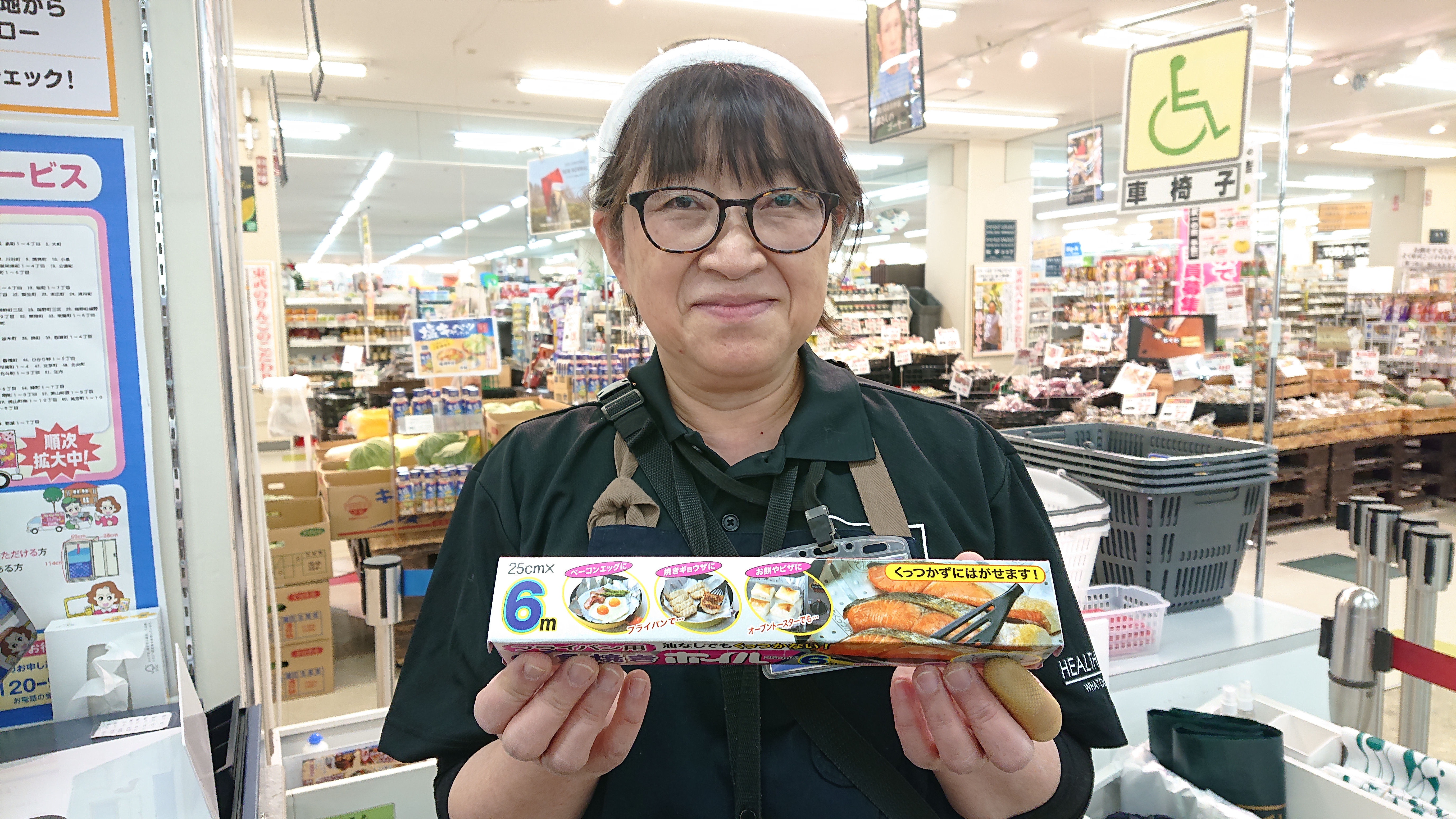 おはようございます。家庭消耗品担当小西です。本日のおすすめ商品は、魚焼きホイルです。油をひかなくても食材がくっきません。おすすめです。