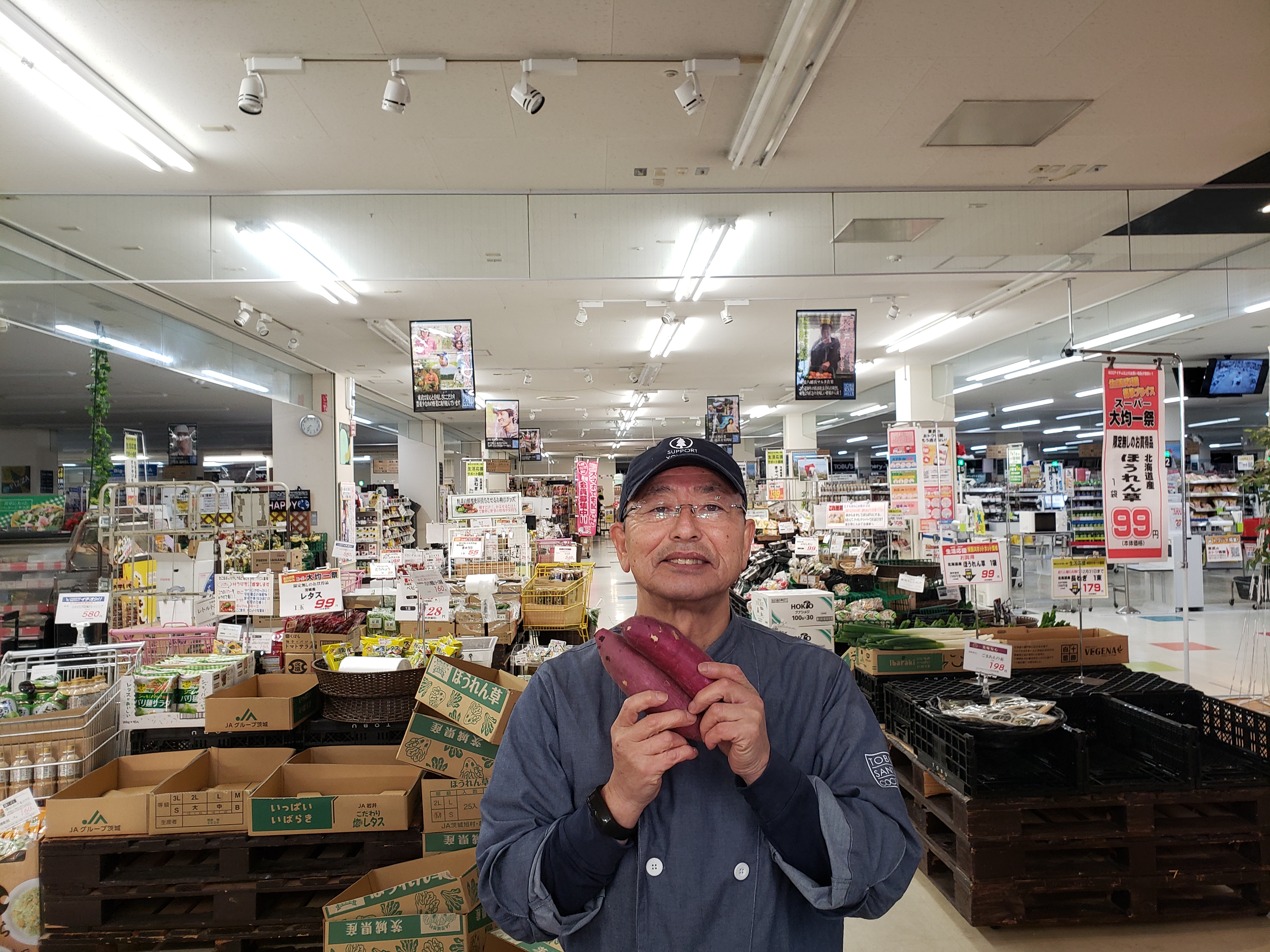 青果コーナーのオススメ!千葉産さつまいも。品種はしっとり滑らかな食感で甘い品種です。1本88円にて販売します