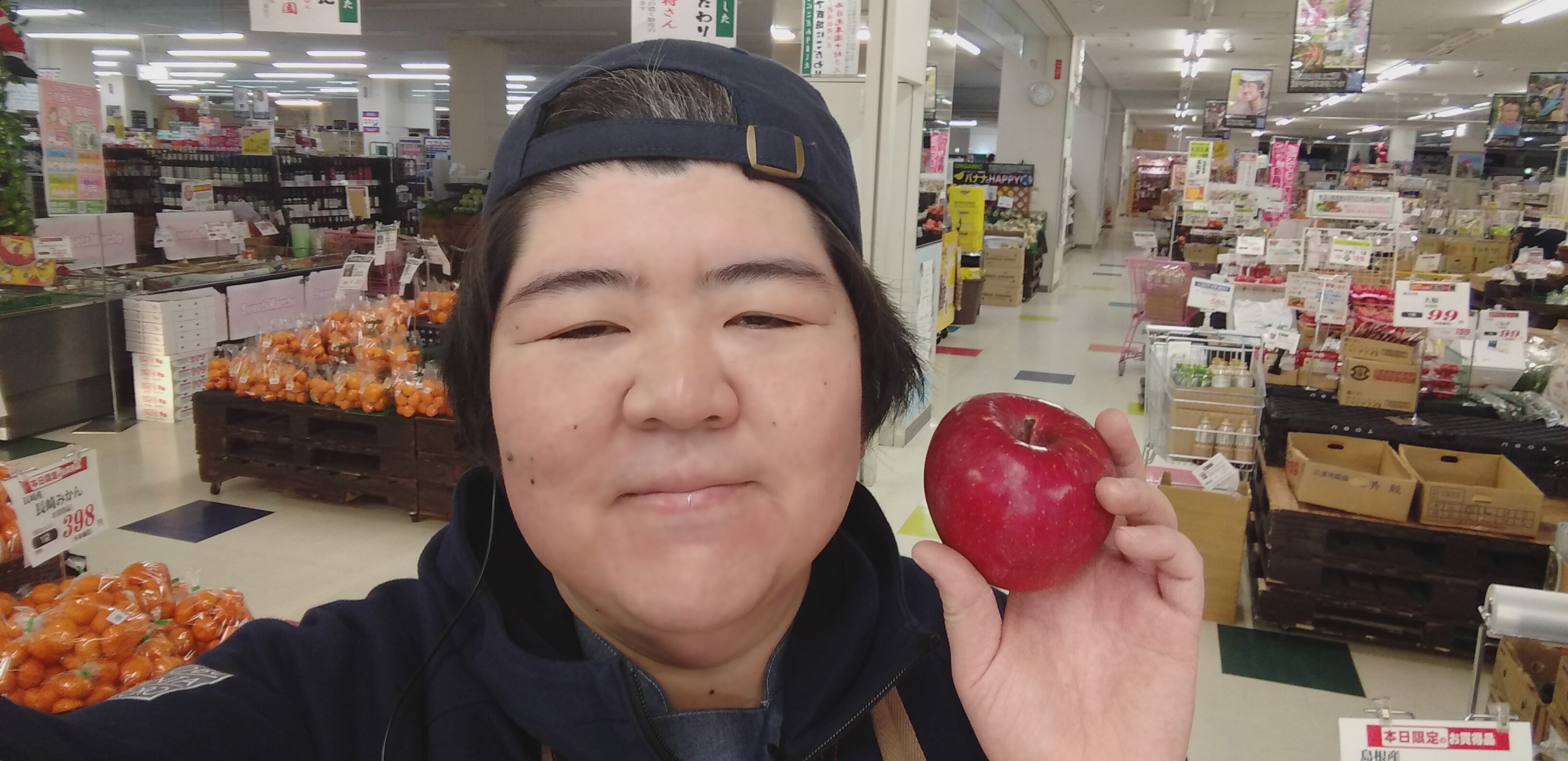 おはようございます。青果担当奥瀬です。本日スーパー大均一祭最終日です。長野産 さんふじりんご 1玉99円です。是非ご利用くださいませ。