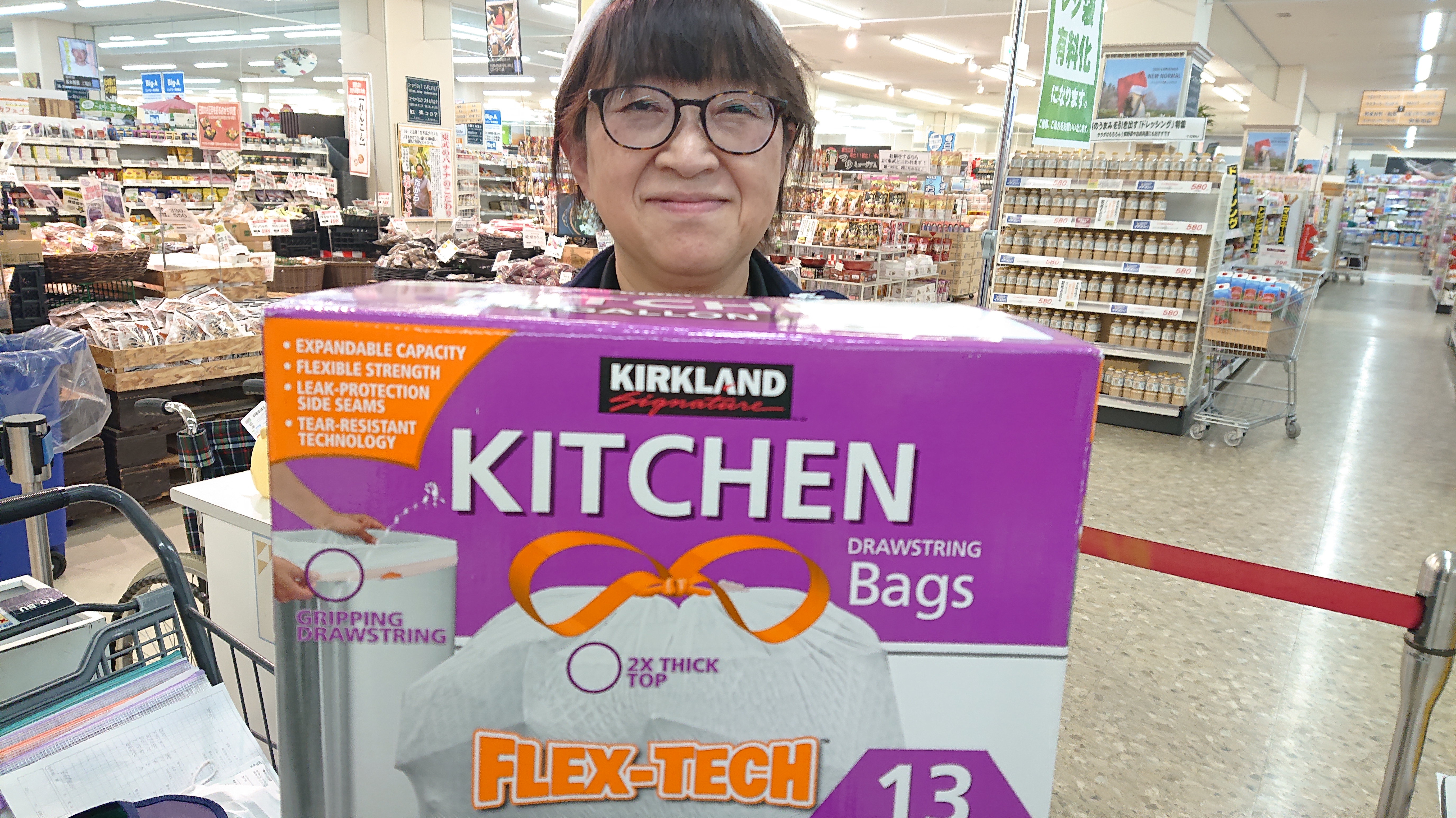 おはようございます。家庭消耗品担当小西です。本日のおすすめ商品は、カークランドシグネチャーひもつきごみ袋です。大容量なのでとても便利です。