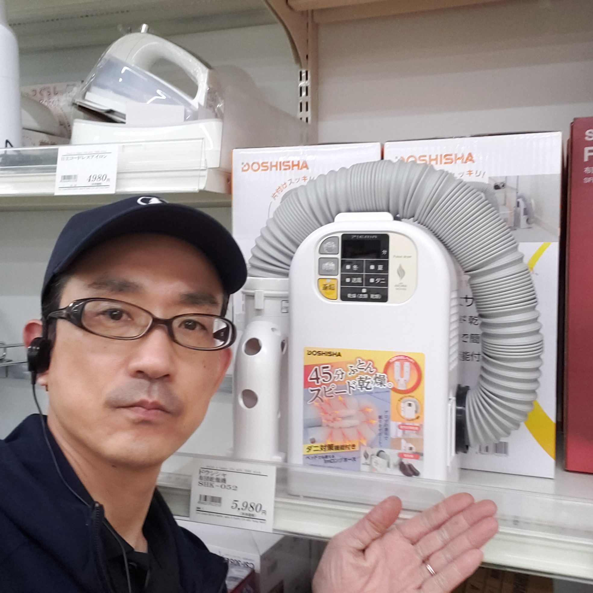 家電コーナーからは!おすすめ!ドウシシャ布団乾燥機です。持ち運びやすいサイズ! 大型吹き出しヘッドで45分スピード乾燥!ダニ対策機能付きです。室内乾燥にも、靴乾燥機にも使えますよ!価格は5980円です。是非お買い求めくださいませ。