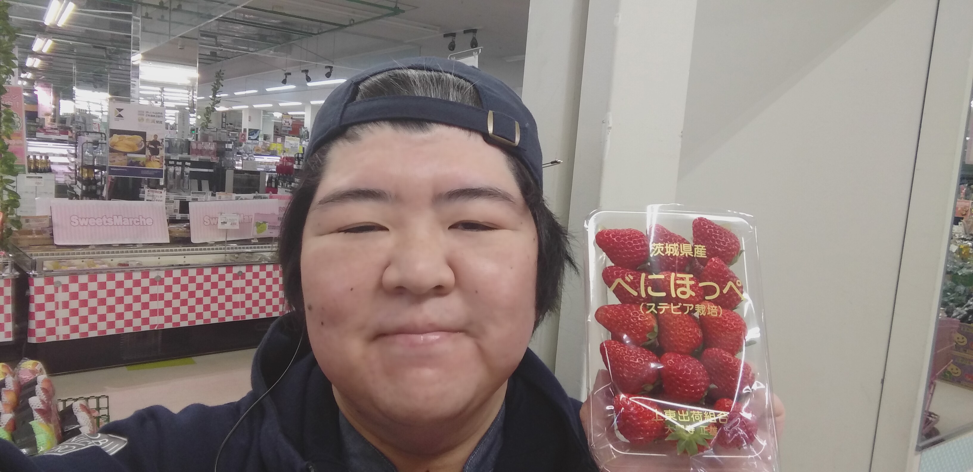 おはようございます。青果担当奥瀬です。年末年始には、当店オススメのいちご、紅ほっぺはいかがでしょうか?肥料と一緒に、農業用の黒蜜を散布することで更に甘さが増す、ステビア栽培の紅ほっぺ。茨城産紅ほっぺいちご、1パック 798円です。是非ご利用くださいませ。本年もご愛顧頂き、ありがとうございました。また来年も、どうぞ宜しくお願いいたします。