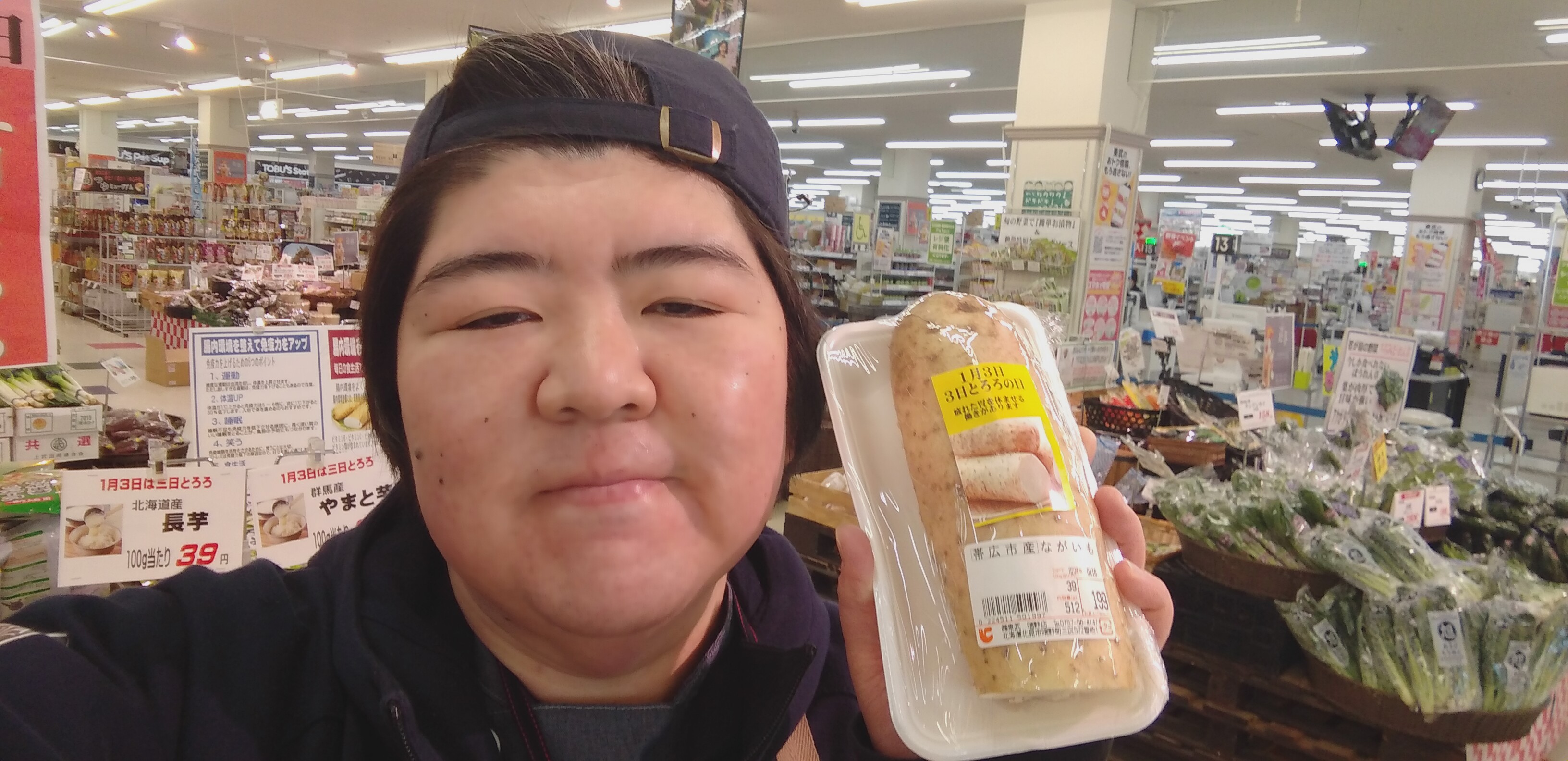 おはようございます。青果担当奥瀬です。明日は三日とろろの日、という事で、長芋、やまといも、ご用意してます。写真は、北海道産長いも 100gあたり39円です。是非ご利用くださいませ。