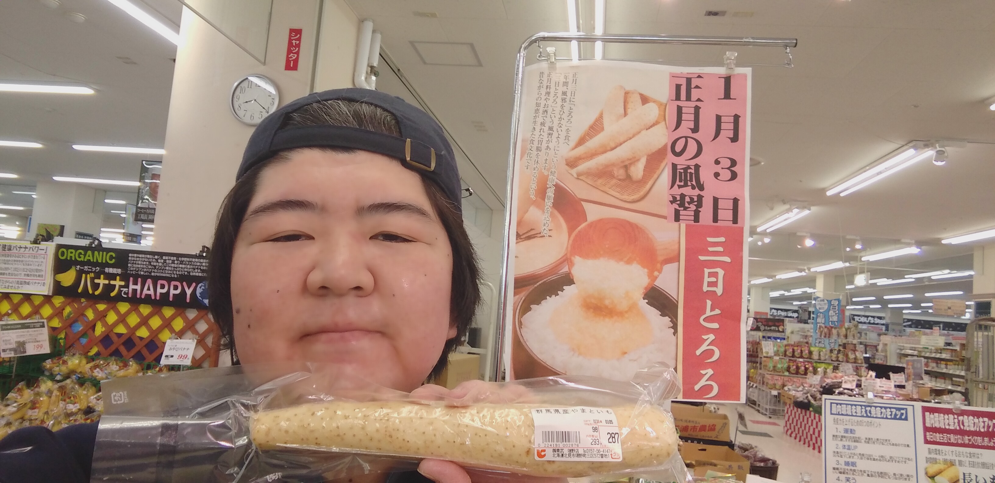 おはようございます。青果担当奥瀬です。本日は1月3日。三日とろろの日です。長いも、やまと芋をご用意しております。お正月料理やお酒で疲れた胃腸を休めてください。群馬産やまと芋 100グラムあたり98円です。皆様の御来店をお待ちしております!