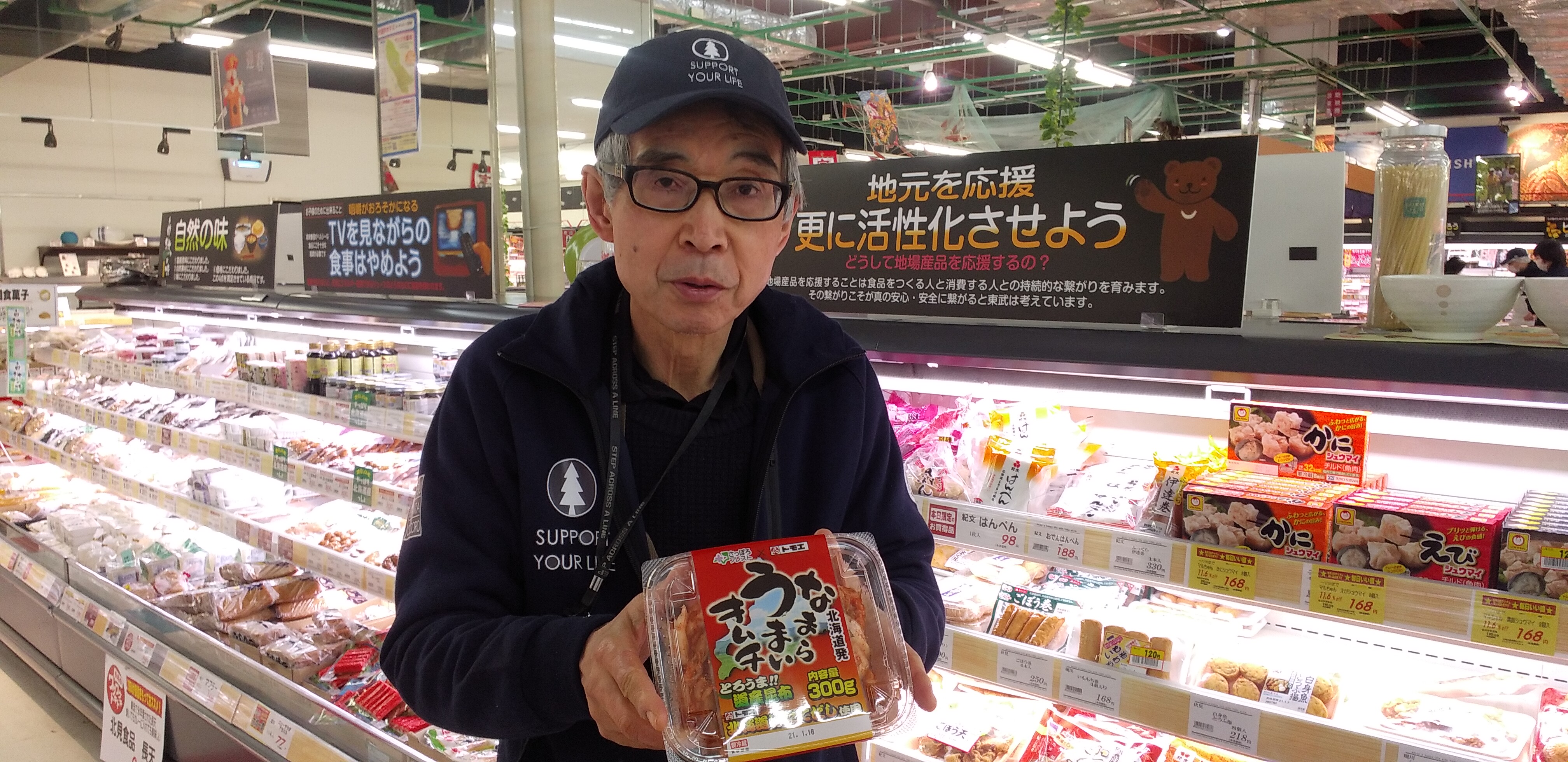 日配コーナーからは、トモエのなまらうまいキムチのご紹介です。北海道のホタテだしを使用した北海道発のキムチ。300グラム入って198円です。どうぞご利用くださいませ。