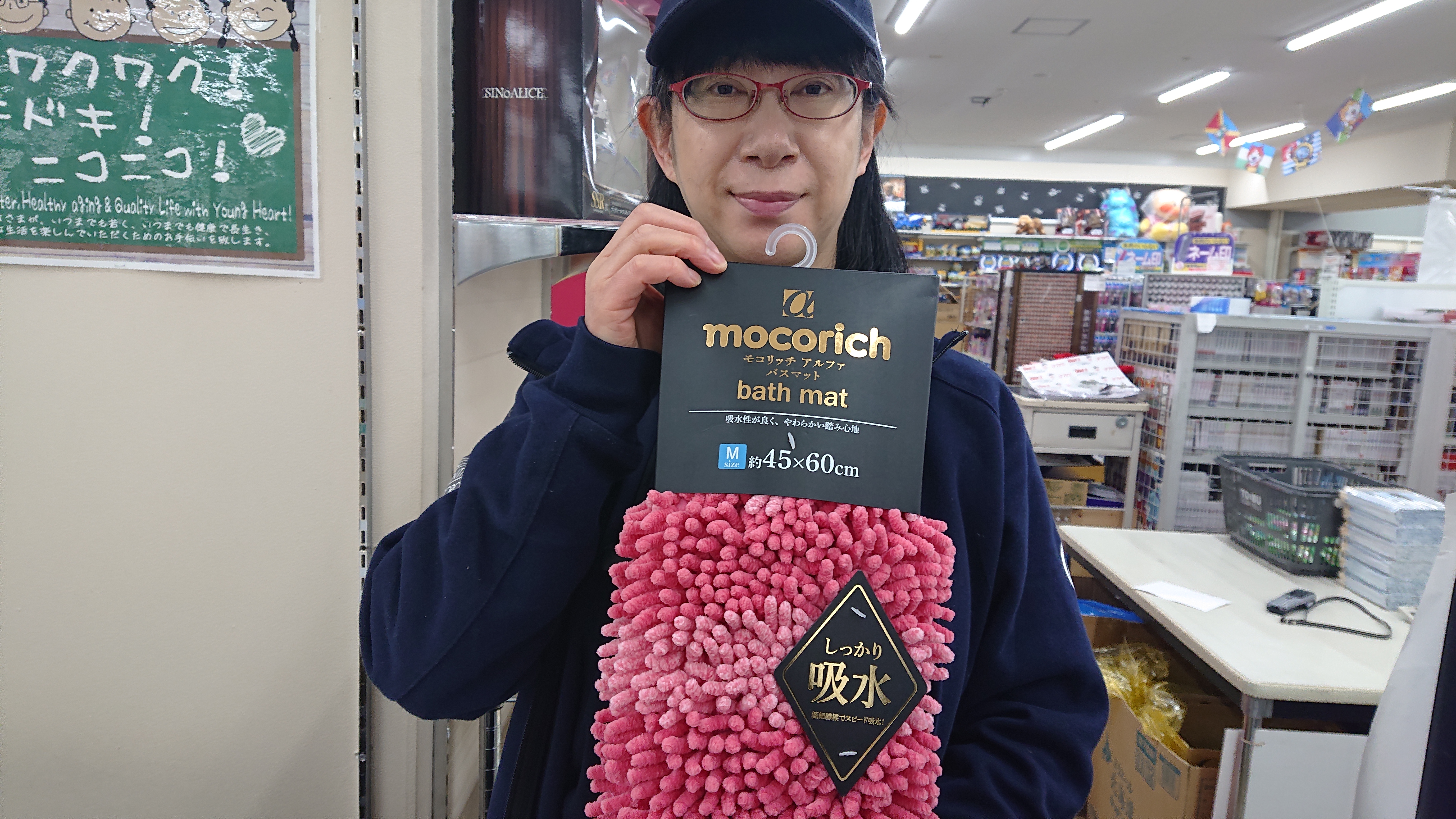 おはようございますけど日用品担当近藤です。本日のおすすめ商品は、カキウチバスマットです。しっかり吸収するのでおすすめです。