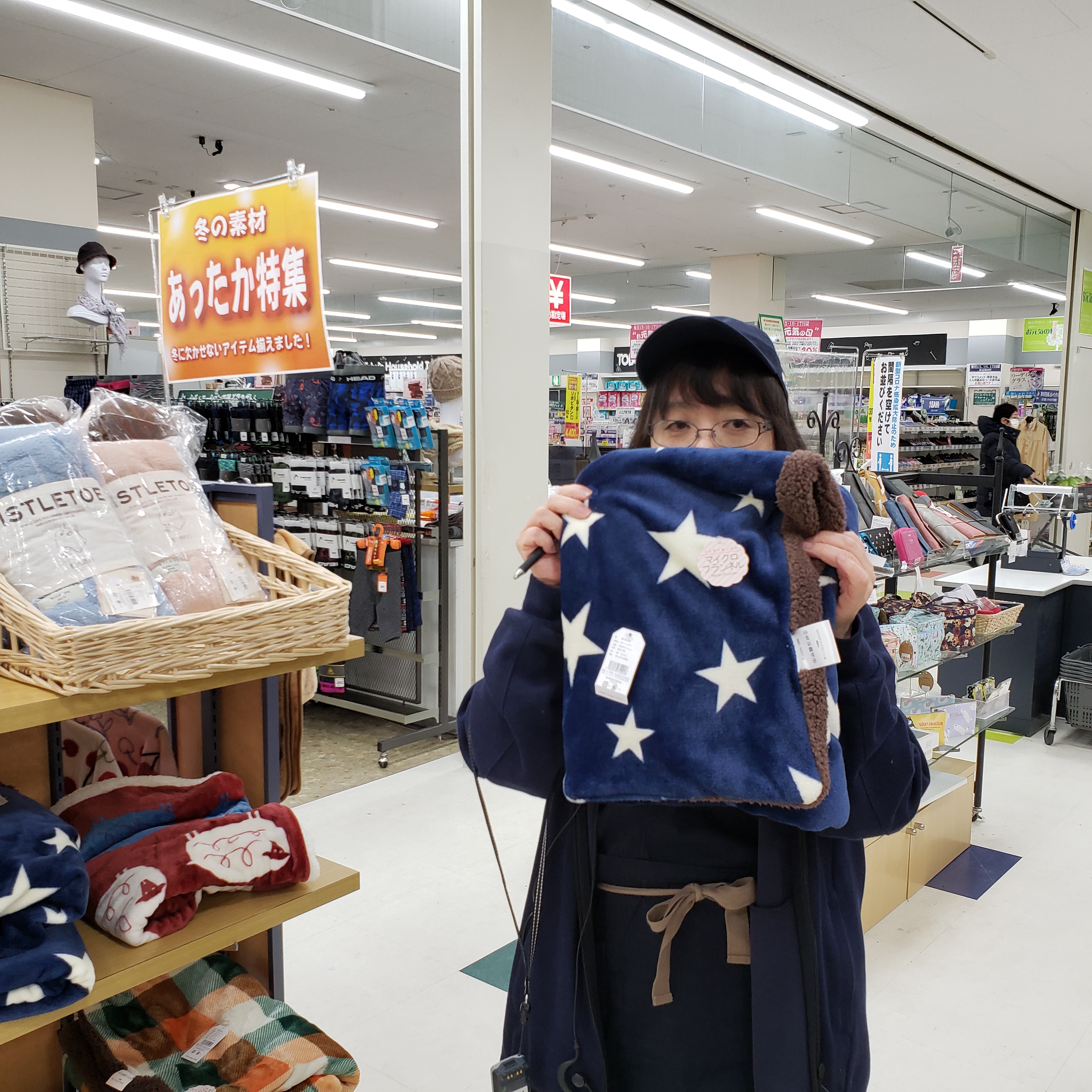 ソフトコーナーからは!おすすめ!ふんわりあったか!マイクロフランネルひざ掛けです!ボア付きで暖かさを逃がさない!サイズは約73cm×100cmです。価格は1800円です。是非お買い求めくださいませ。