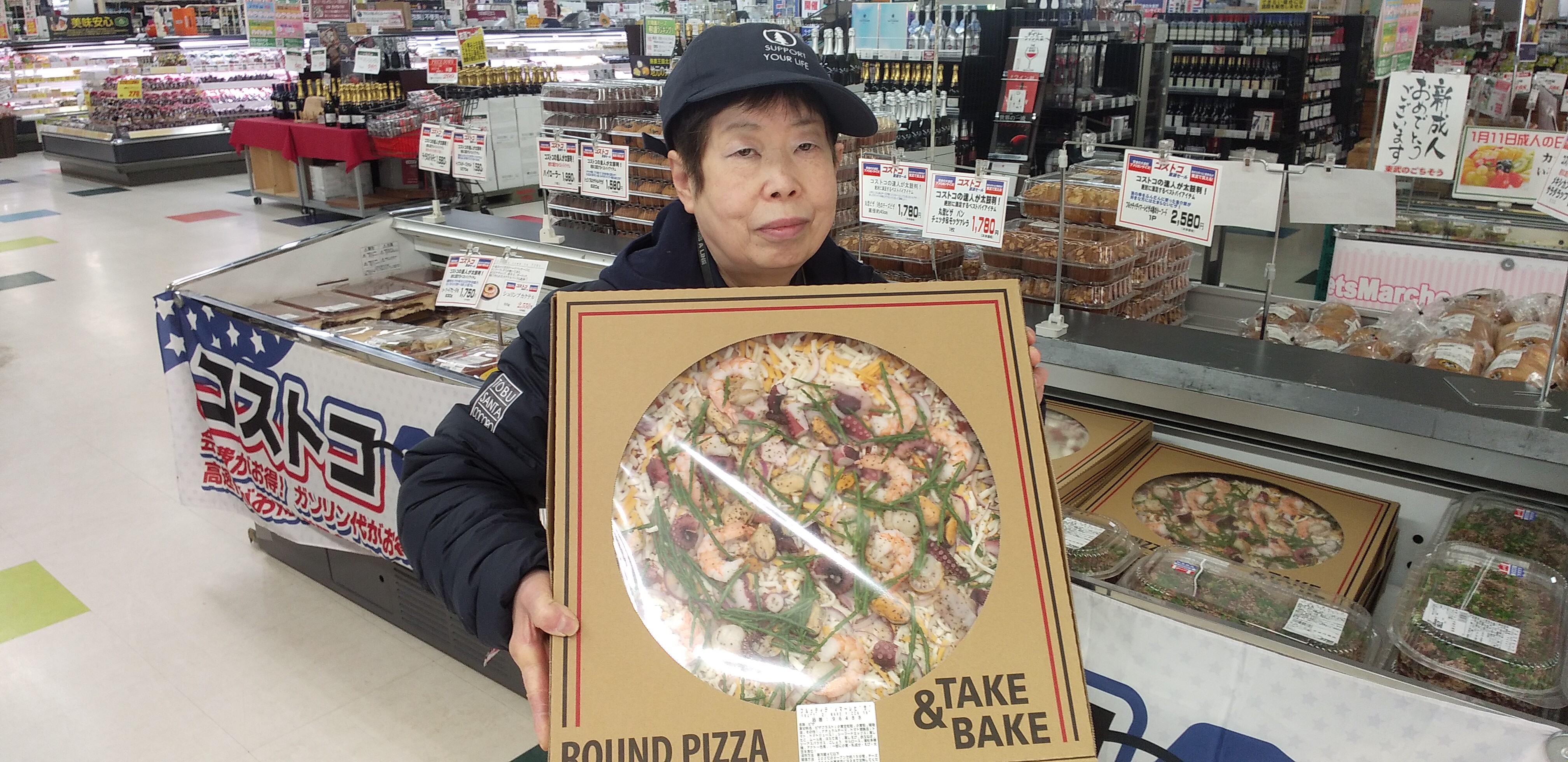 日配コーナーからは、コストコの新商品、フルッティデイマーレピザのご紹介です。海の幸をふんだんに使った、魚介類が好きな方にはたまらないピザ。直径約40センチの大ボリューム!1枚入って2580円です。本日はコストコセール最終日!コストコのピザを買うなら今日中に。