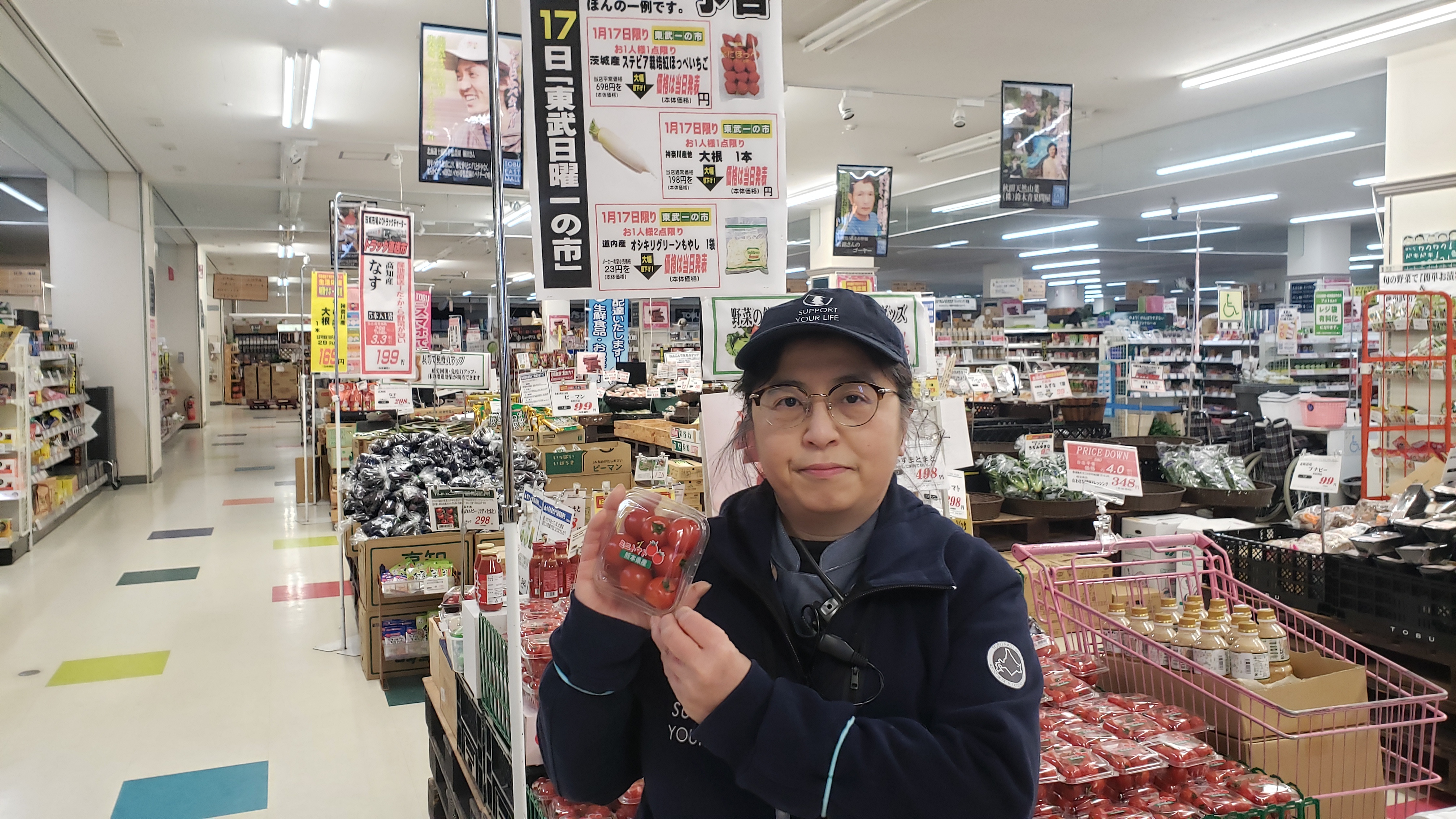 青果コーナーのオススメ!熊本産ミニとまとがお買得です。1パック199円にて販売します