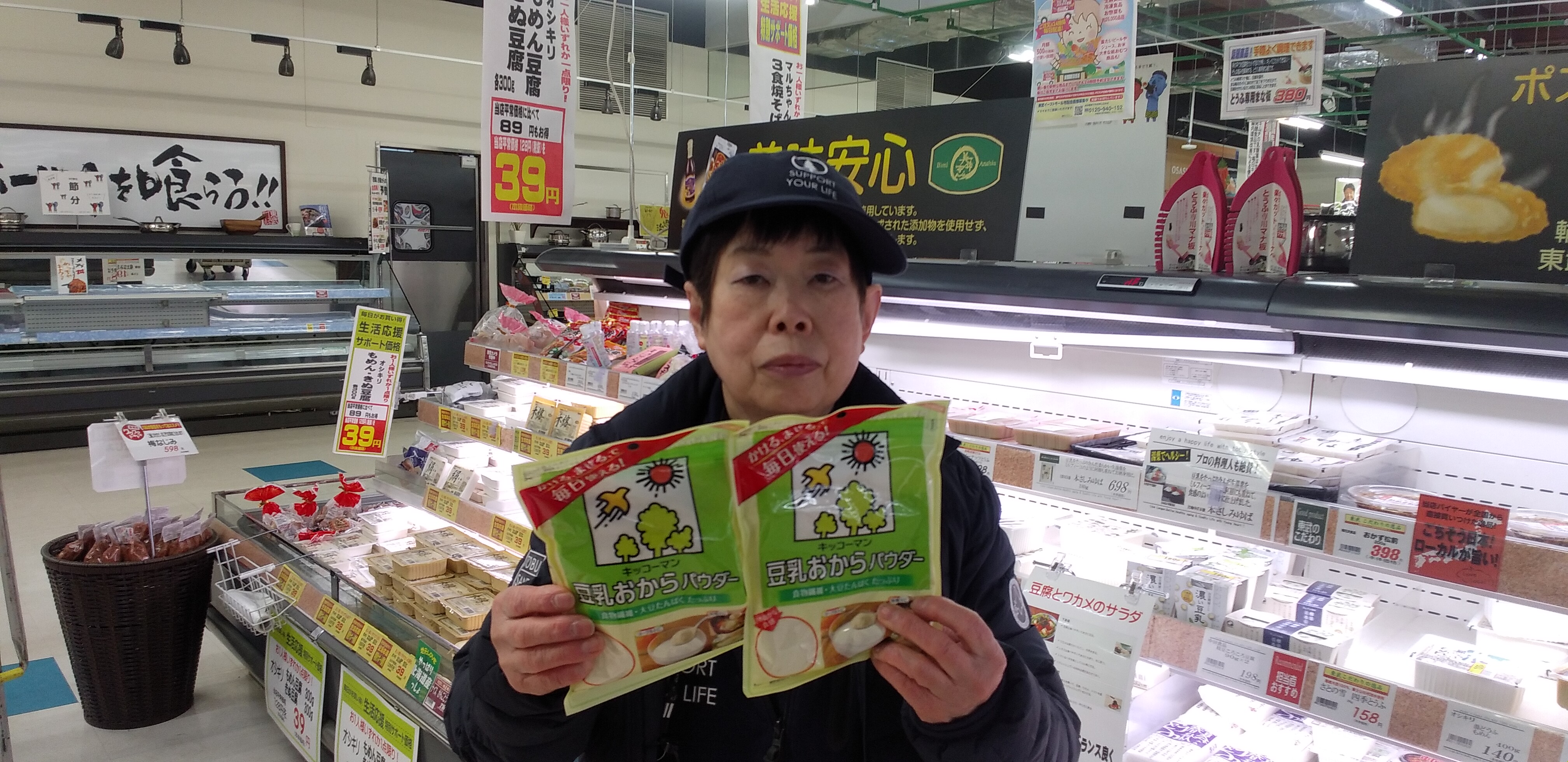 日配コーナーからは、キッコーマンのおからパウダーのご紹介です。かけたり混ぜたりで手軽に食物繊維、大豆タンパクを摂取できます。豆乳おからパウダー 120グラム 1袋 200円です。是非ご利用くださいませ。