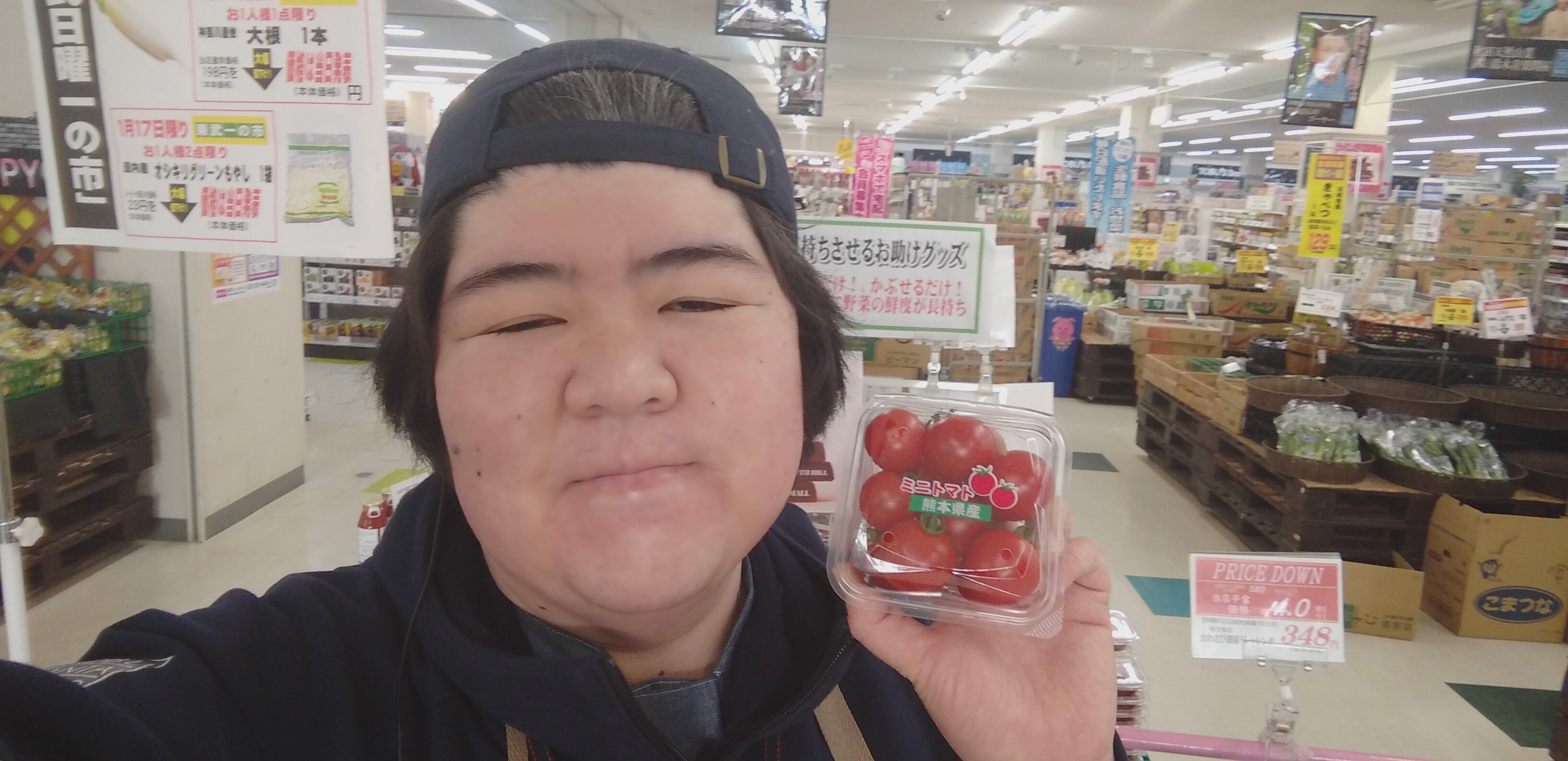 おはようございます。青果担当奥瀬です。本日もミニトマトがお買い得です。熊本産ミニトマト 1パック 199円です。サラダに、お弁当に、是非ご利用ください。