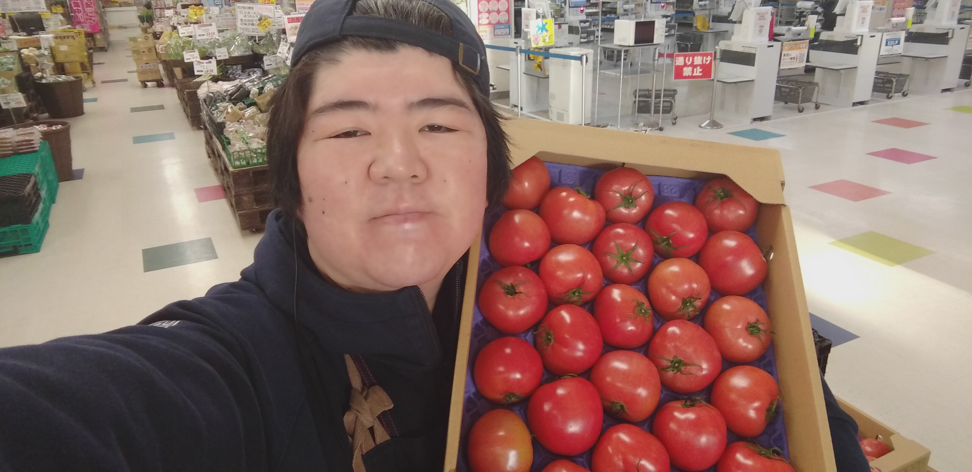 おはようございます。青果担当奥瀬です。本日はとまとの箱売りがあります。熊本産とまと1箱約4キロ入り、990円です。サイズはSとL(写真はSサイズ)。是非ご利用くださいませ。