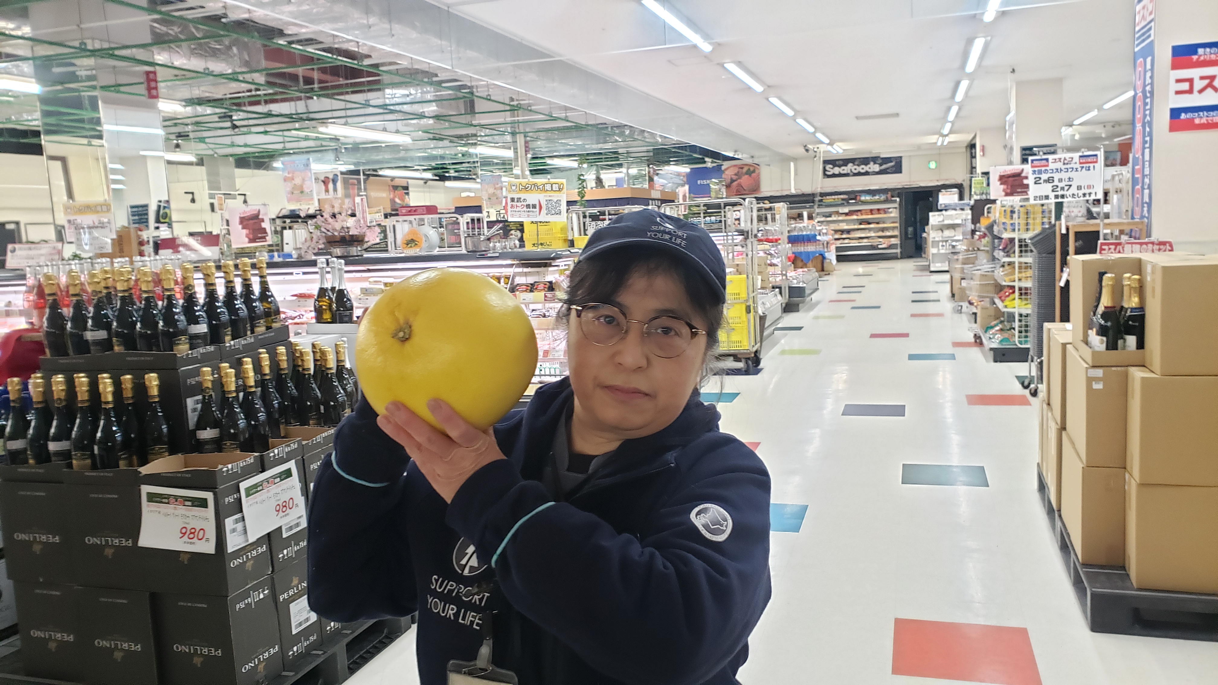 青果コーナーのオススメ!熊本産晩白柚。世界一大きい柑橘と言われています。ジューシーな果肉と爽やかな酸味の柑橘です