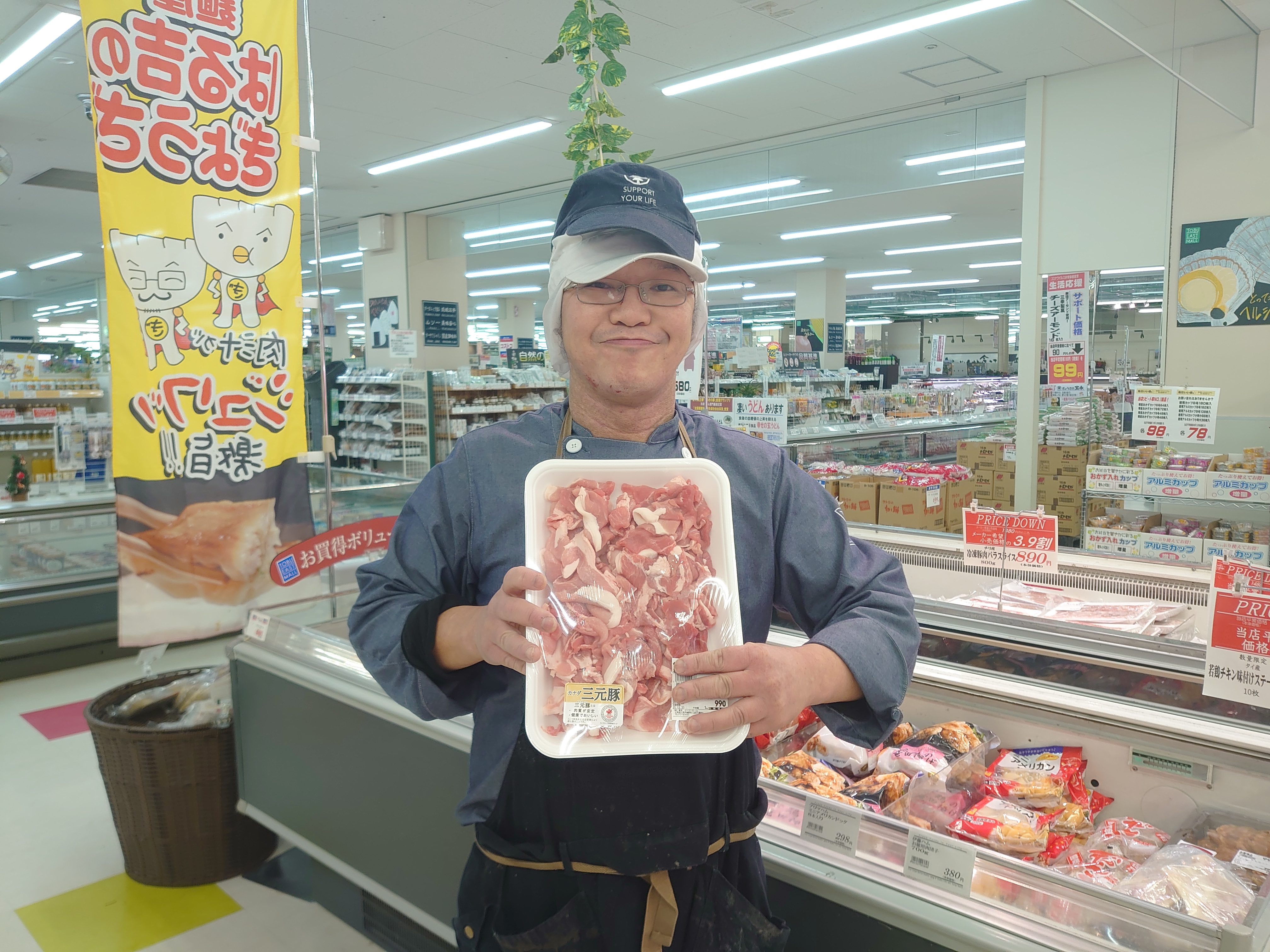 おはようございます。ミート担当近藤 です。使用用途の一例と致しまして豚小間で胡麻和え炒めでほうれん草だけで胡麻和えが出来るレシピに豚小間ともやしを加えました。