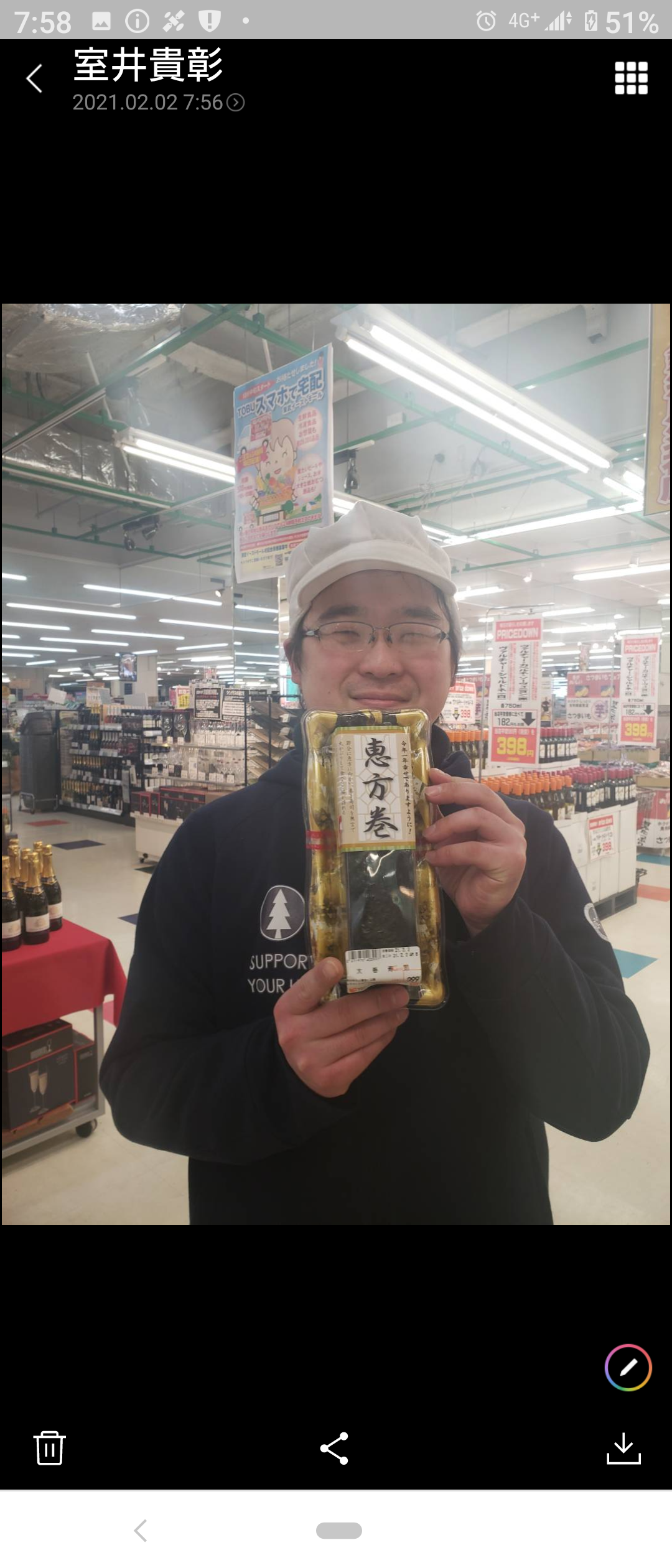 おはようございます。惣菜担当堀口です 。本日、2月2日は124年ぶりと言われる節分の日です。今年の方角は南南東です。当コーナーのおすすめ商品は太巻寿司です。他にも多数ありますので宜しくお願い致します。