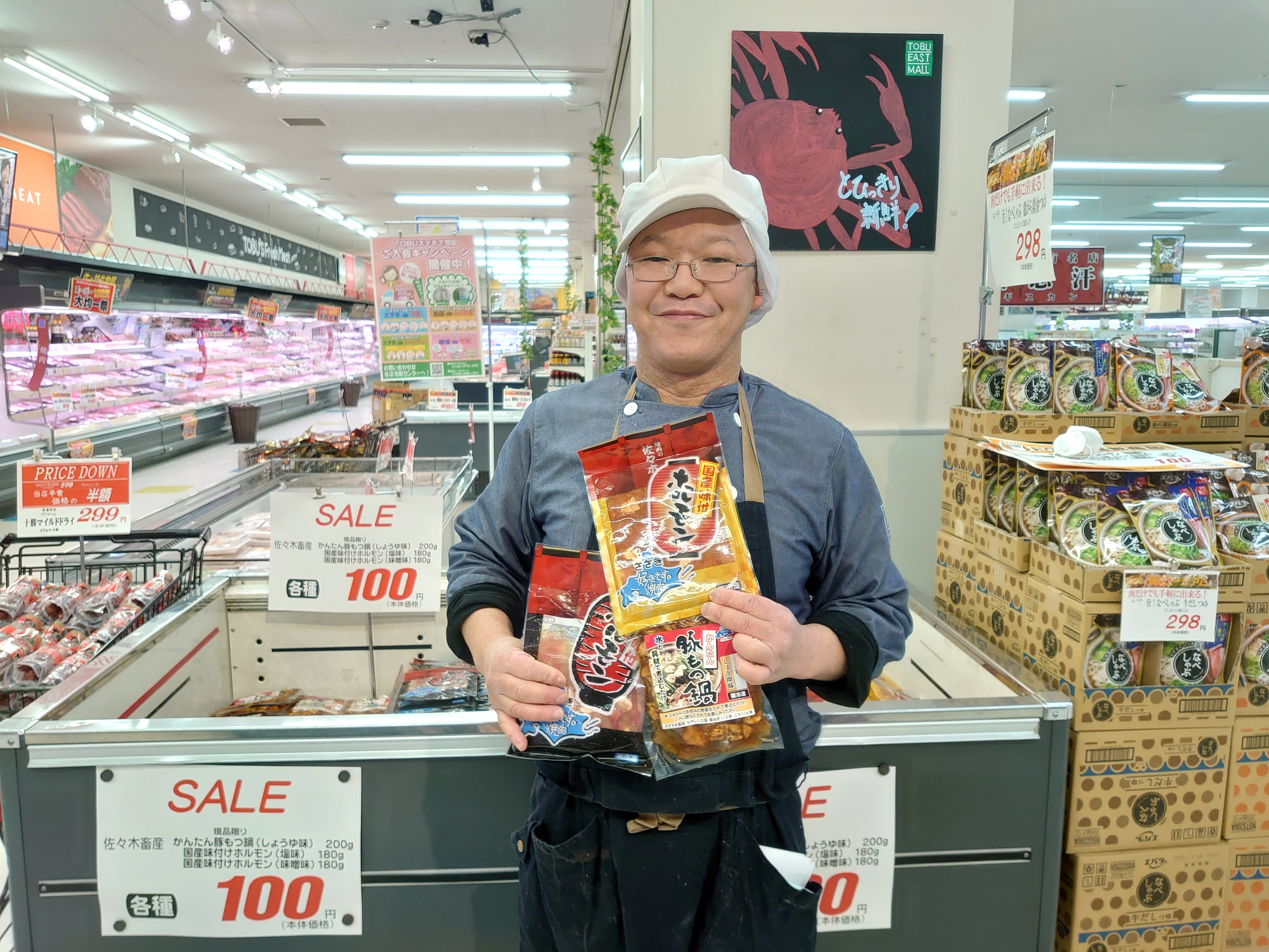 おはようございます。ミート担当近藤です。かんたん豚もつ鍋(醤油味)、国産味付けホルモン(味噌味)、国産味付けホルモン(塩味)の3種類ありまして各種100円(税抜)となっています。現品限りです。