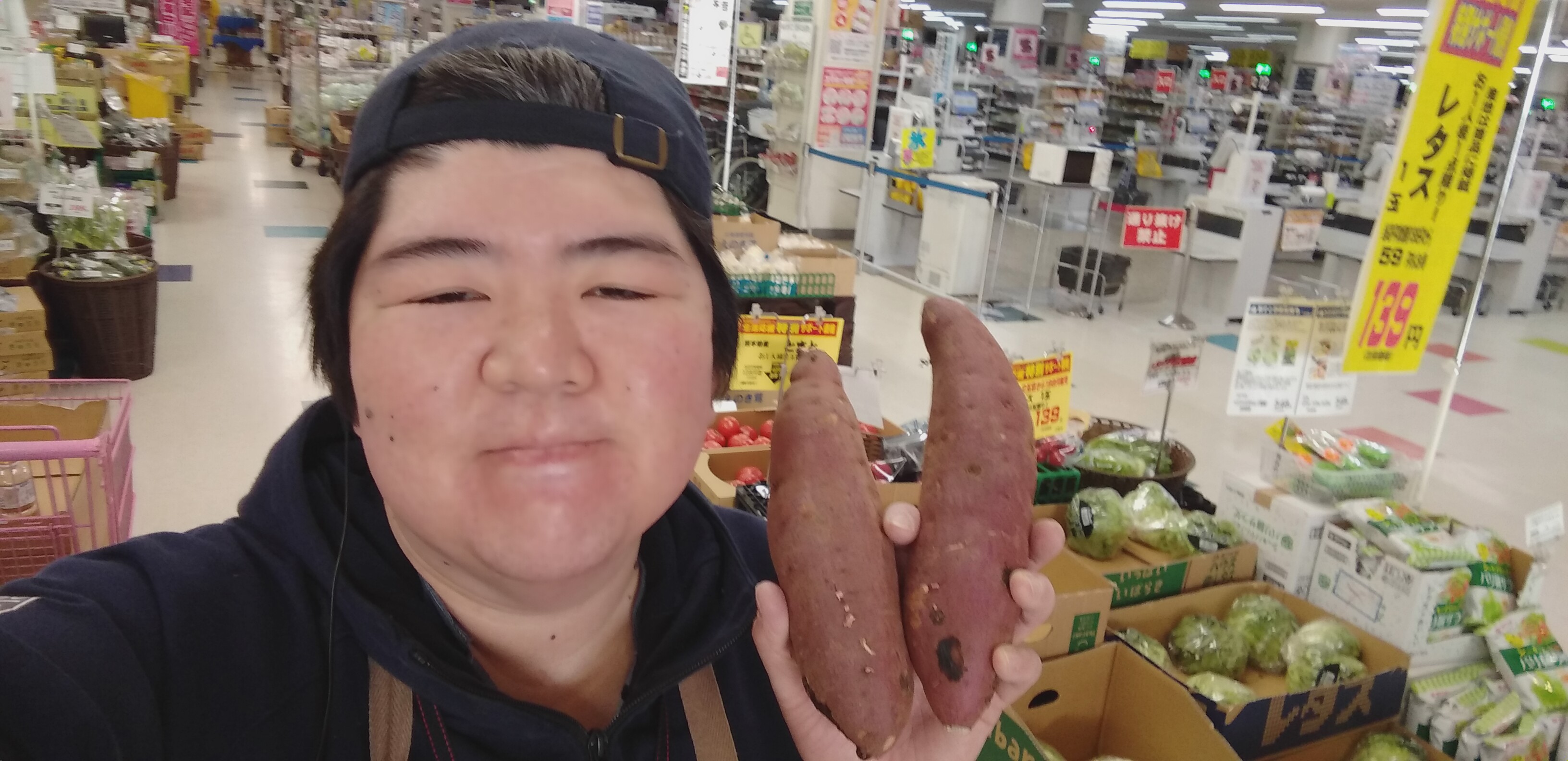 おはようございます。青果担当奥瀬です。本日もスーパー大均一祭です。さつまいもがお買い得です。1本155円となっております。茨城の紅はるか、シルクスイート、徳島の金時芋など、全てが1本155円。是非ご利用くださいませ。