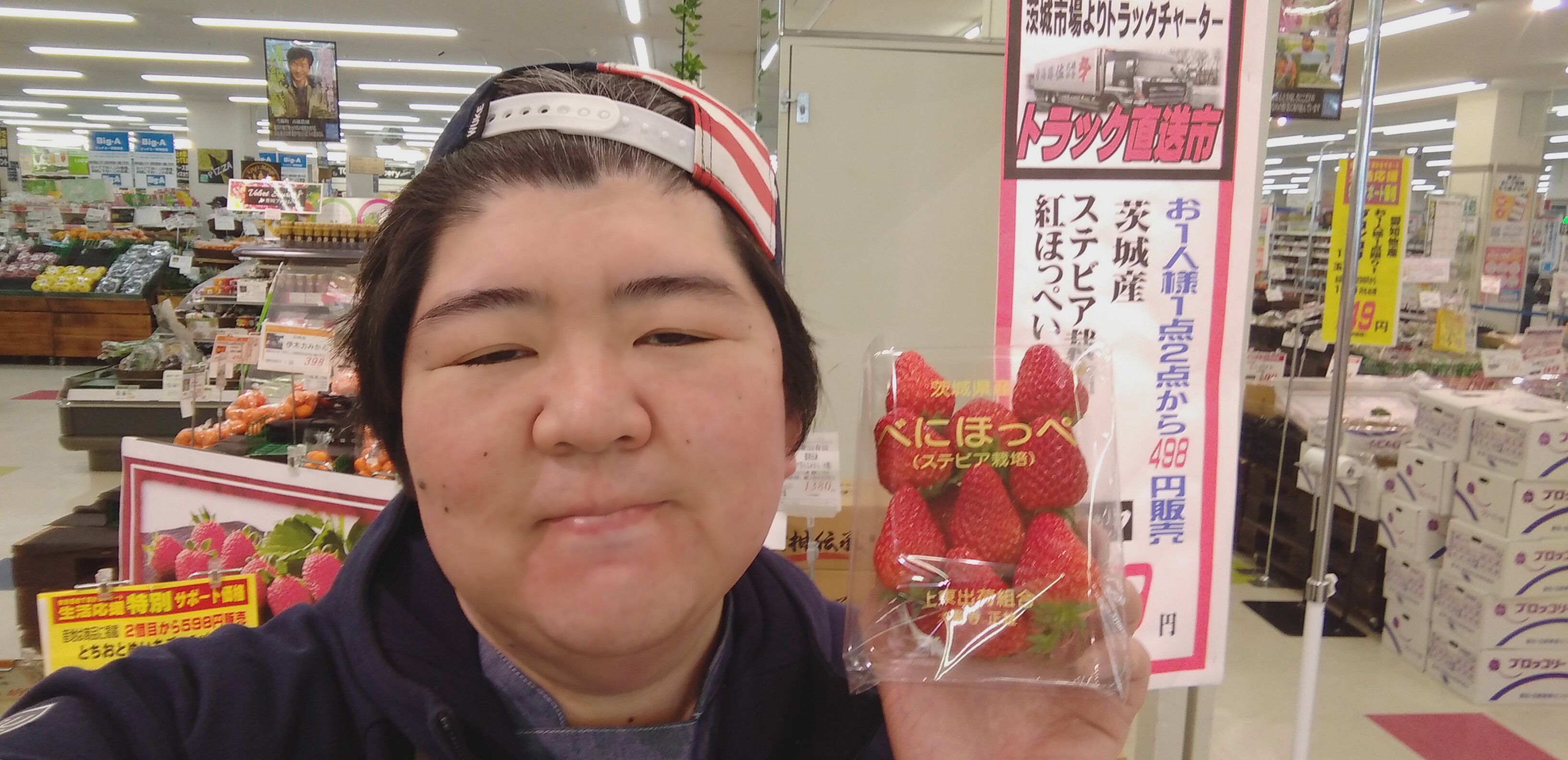 おはようございます。青果担当奥瀬です。本日は日曜一の市です。各コーナーお買い得な品を多数ご用意しております。青果コーナーからは、茨城産のステビア栽培べにほっぺいちご、1パック399円です。是非ご利用くださいませ。また、本日はコストコセールも開催中です。数量に限りがありますので、お早めの御来店お待ちしております!