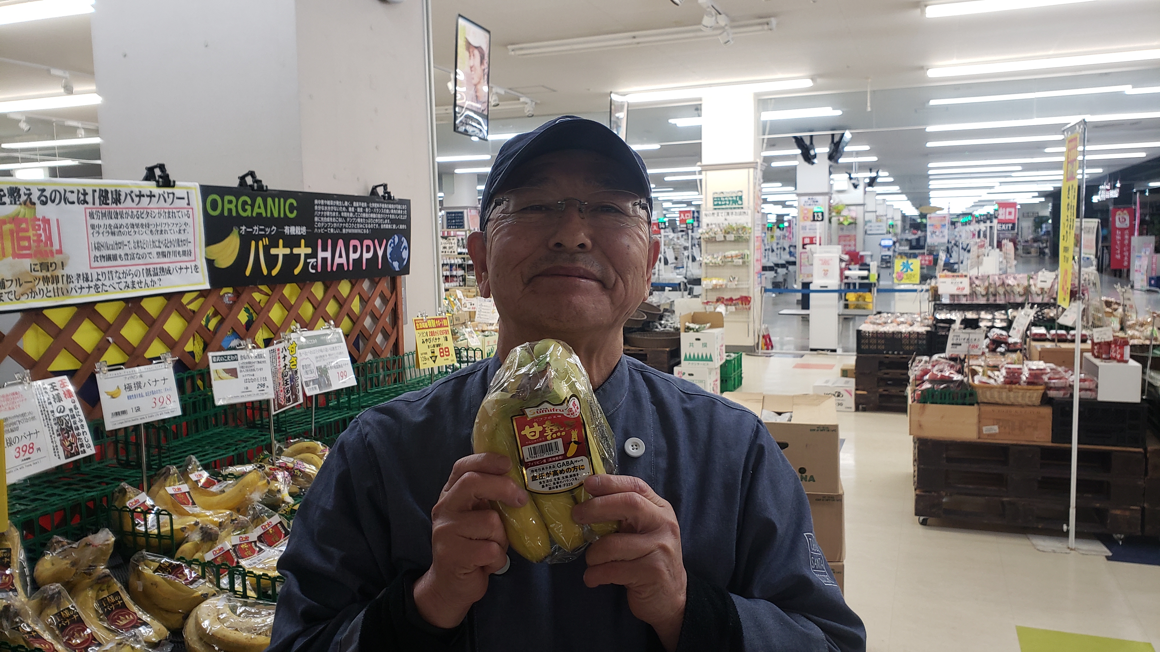 青果コーナーのオススメ!フィリピン産甘熟王バナナがお買得です。1袋189円にて販売します。高地栽培で甘いバナナです