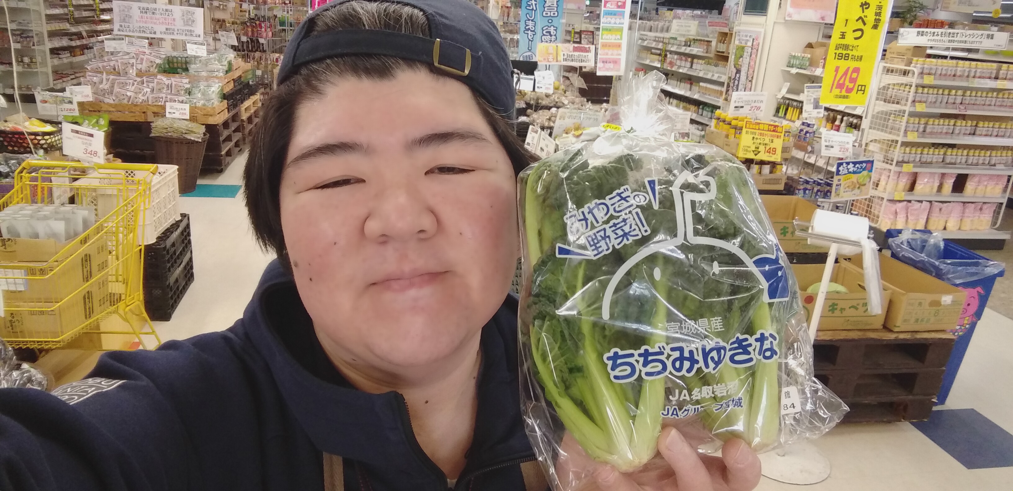 おはようございます。青果担当奥瀬です。今日もスーパー大均一祭開催中です。本日のおすすめは、宮城産のちぢみゆきな。おひたしや炒め物、ナムルにもお使い頂けます。ぜひご利用くださいませ。宮城産ちぢみゆきな、1袋99円です。御来店お待ちしております!