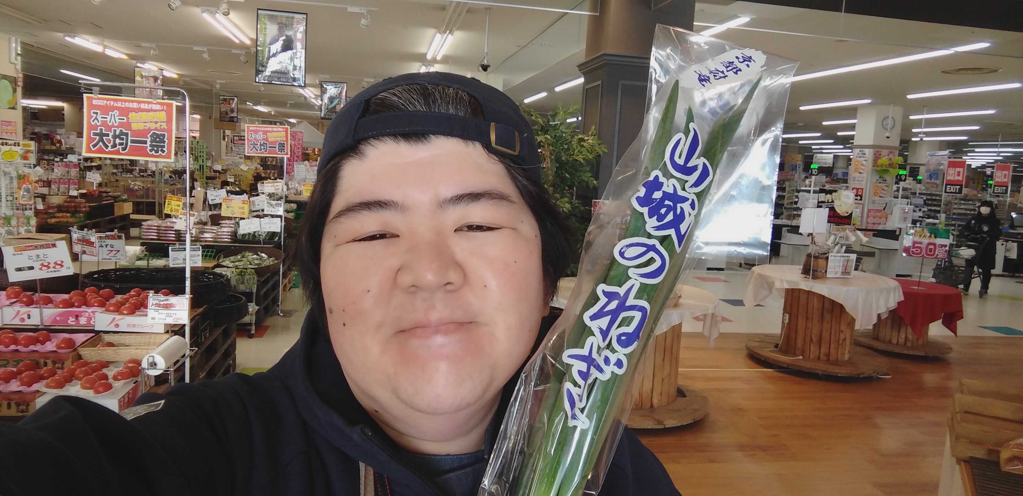 おはようございます。青果担当奥瀬です。本日からスーパー大均一祭です。青果コーナーでもお買い得な品を多数ご用意しております。例えば、京都産九条ねぎ「山城のねぎ」。最近ねぎが値上がりしてますが、この山城のねぎは1袋99円です。お買い得です。是非ご利用くださいませ。皆様の御来店をお待ちしております!
