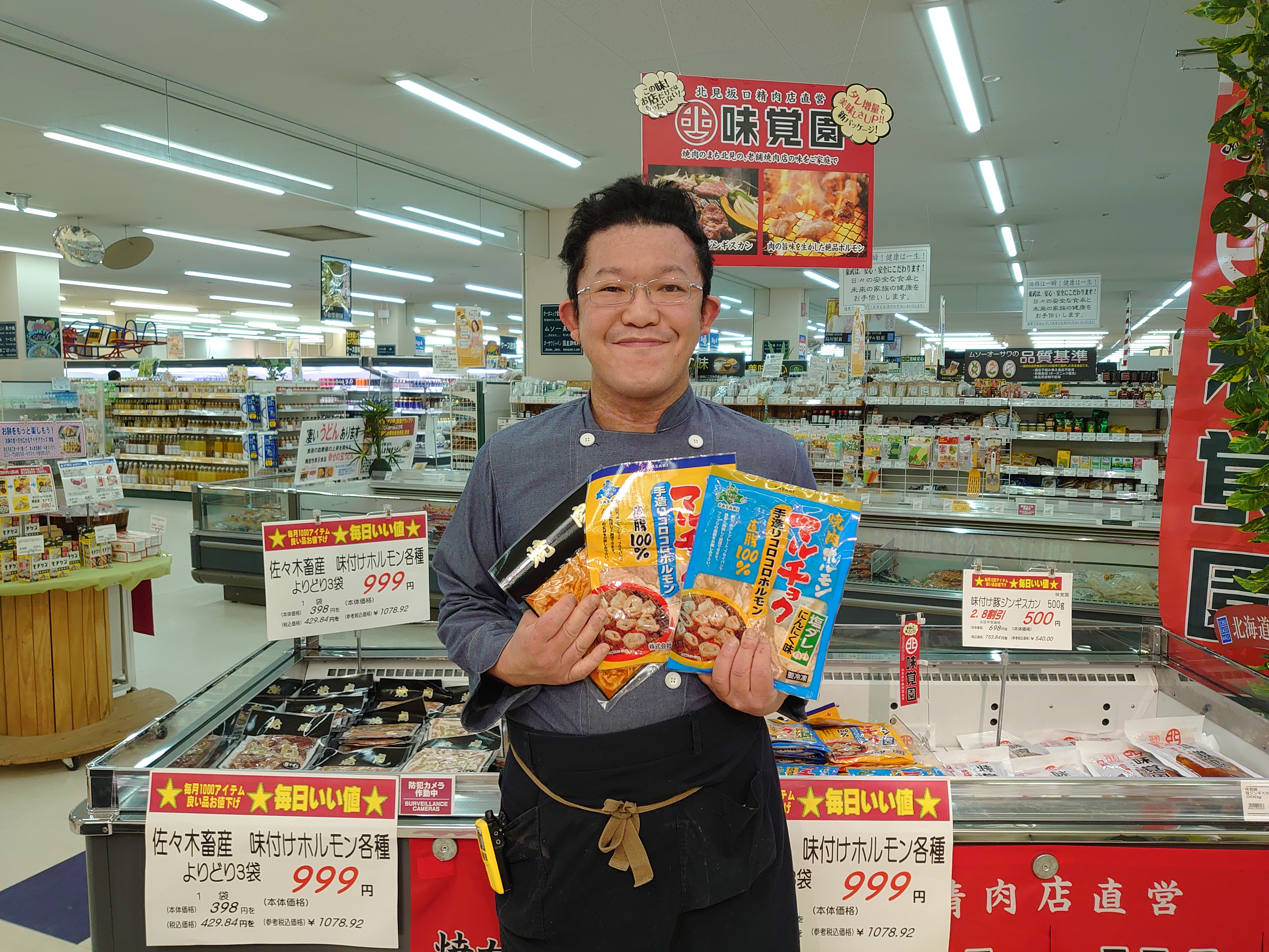 おはようございます。ミート担当近藤です。牛ホルモン・味噌ホルモン・塩ホルモン・豚サガリ・豚ガツ・トントロ・マルチョクホルモン(塩味・塩ダレにんにく味)の8種類と取揃えております、価格は各種一袋・398円(本体価格)、429.84円(税込)のよりどり3袋・999円(本体価格)、1078.92円(税込)となっています。