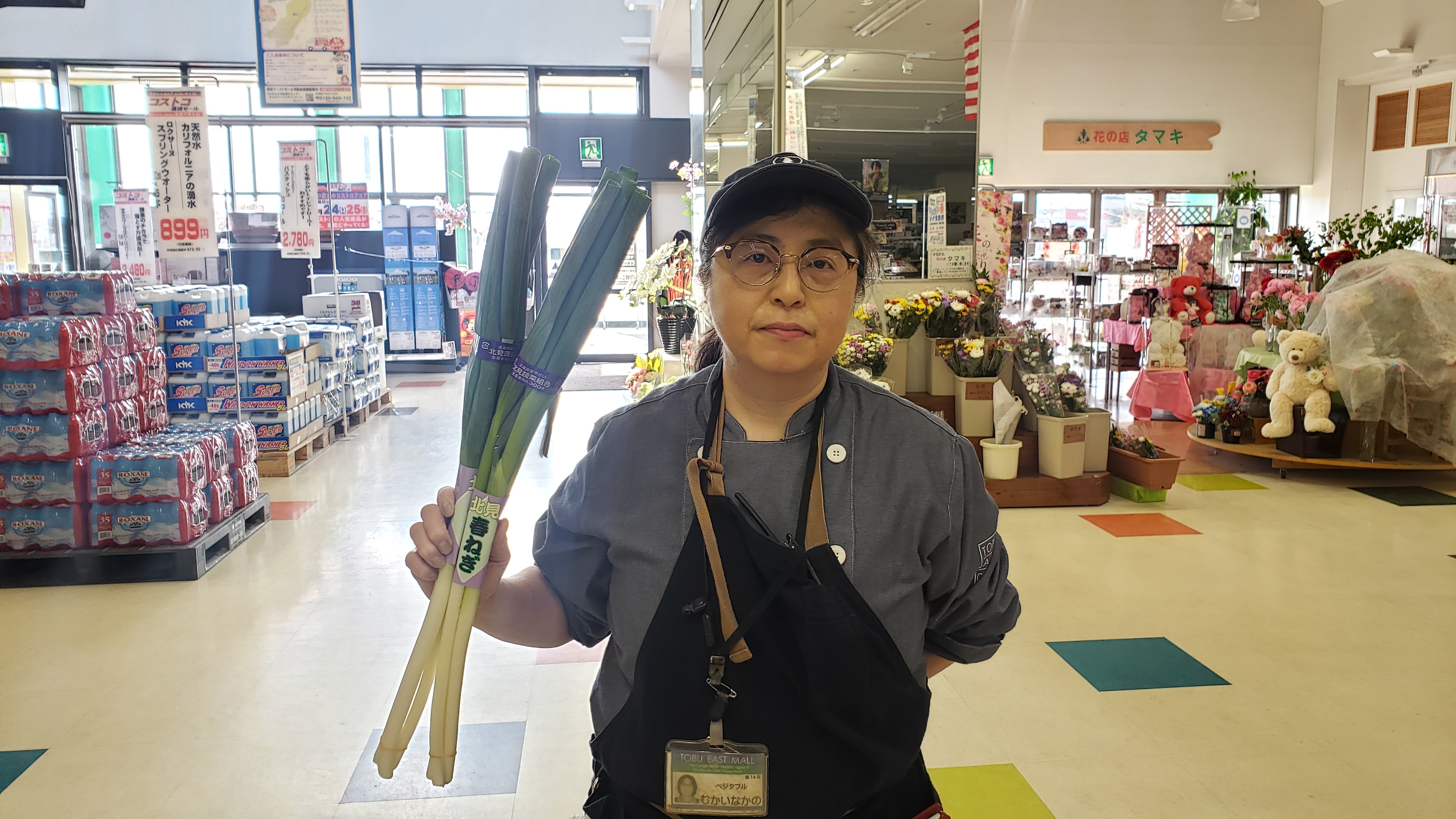 青果コーナーのオススメ!地元北見産春ネギ入荷しました。柔らかく薬味にもオススメ。1束198円にて販売します