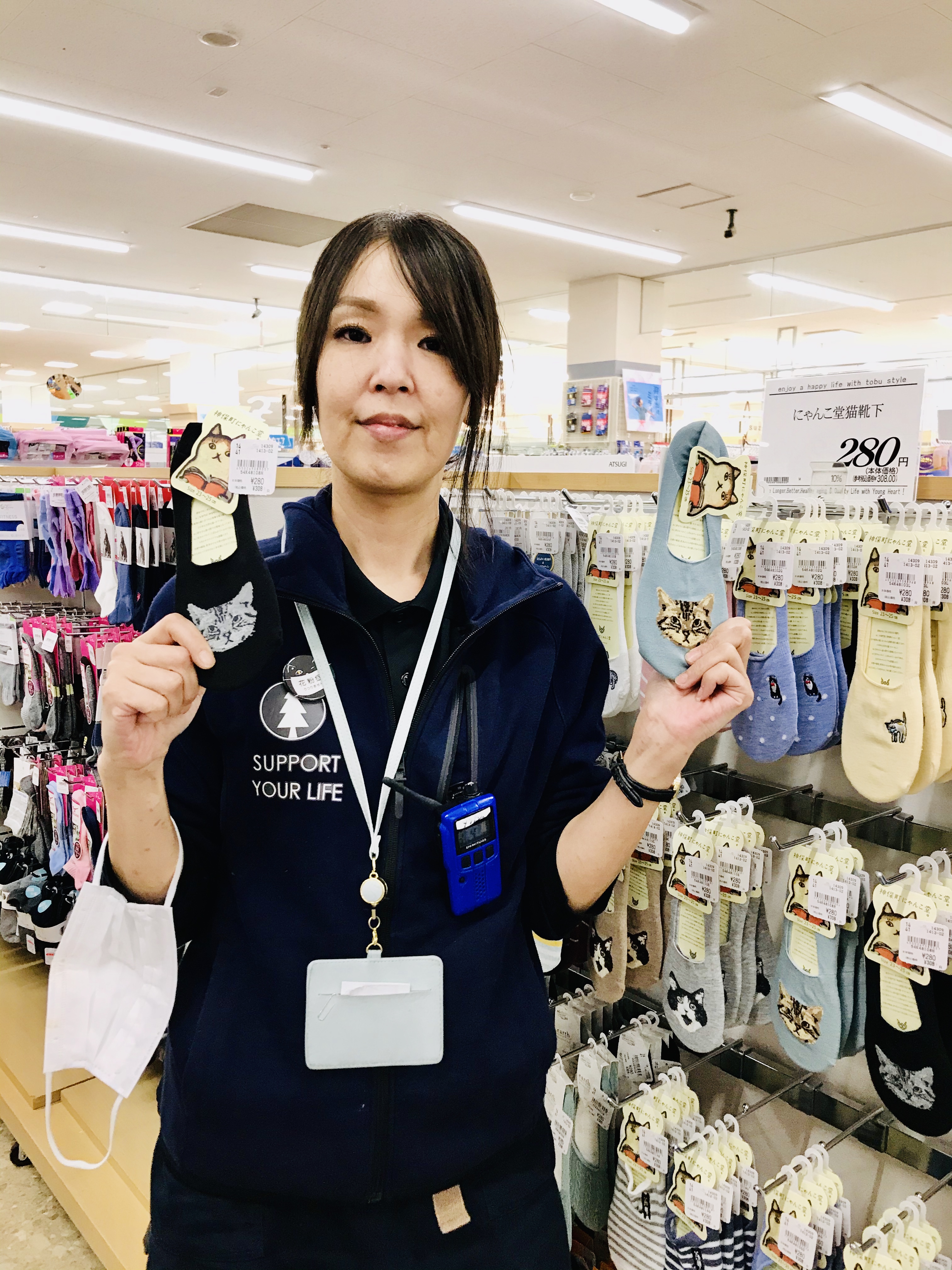 【神保町にゃんこ堂】東京の神保町にある姉川書店の中に別名『猫好きホイホイ』とも言われる猫本専門「神保町にゃんこ堂」。その「にゃんこ堂」とのコラボで生まれたかわいいネコ柄ソックスです。¥280(参考税込価格¥308)柄も可愛いネコちゃんが 沢山います(*´꒳`*)ネコ好きにはたまりませんね♫