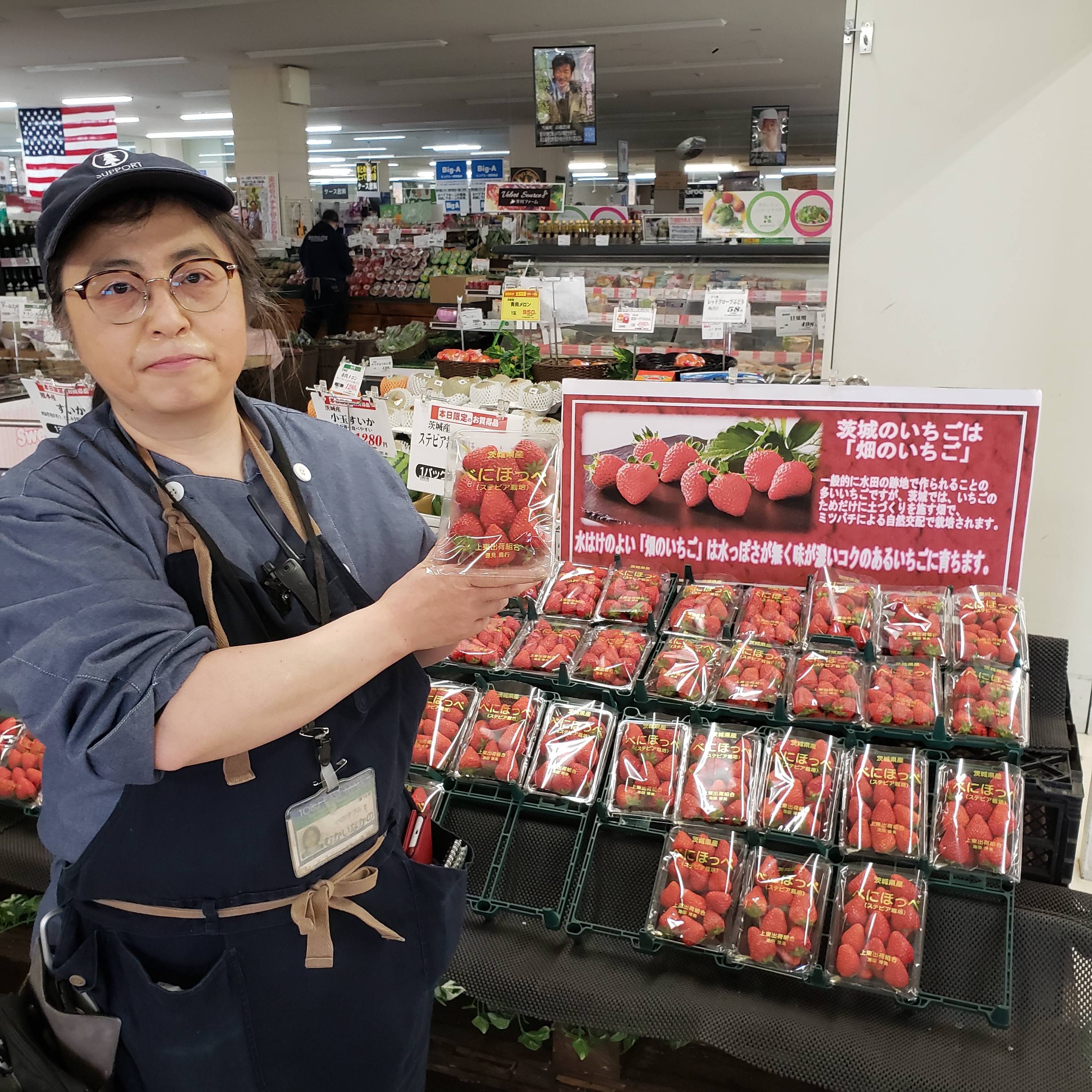 青果コーナーからは!おすすめ!!水っぽさが無く味が濃いコクのあるいちご!!茨城県産べにほっぺいちご!! 価格は399円です。是非お買い求めくださいませ。