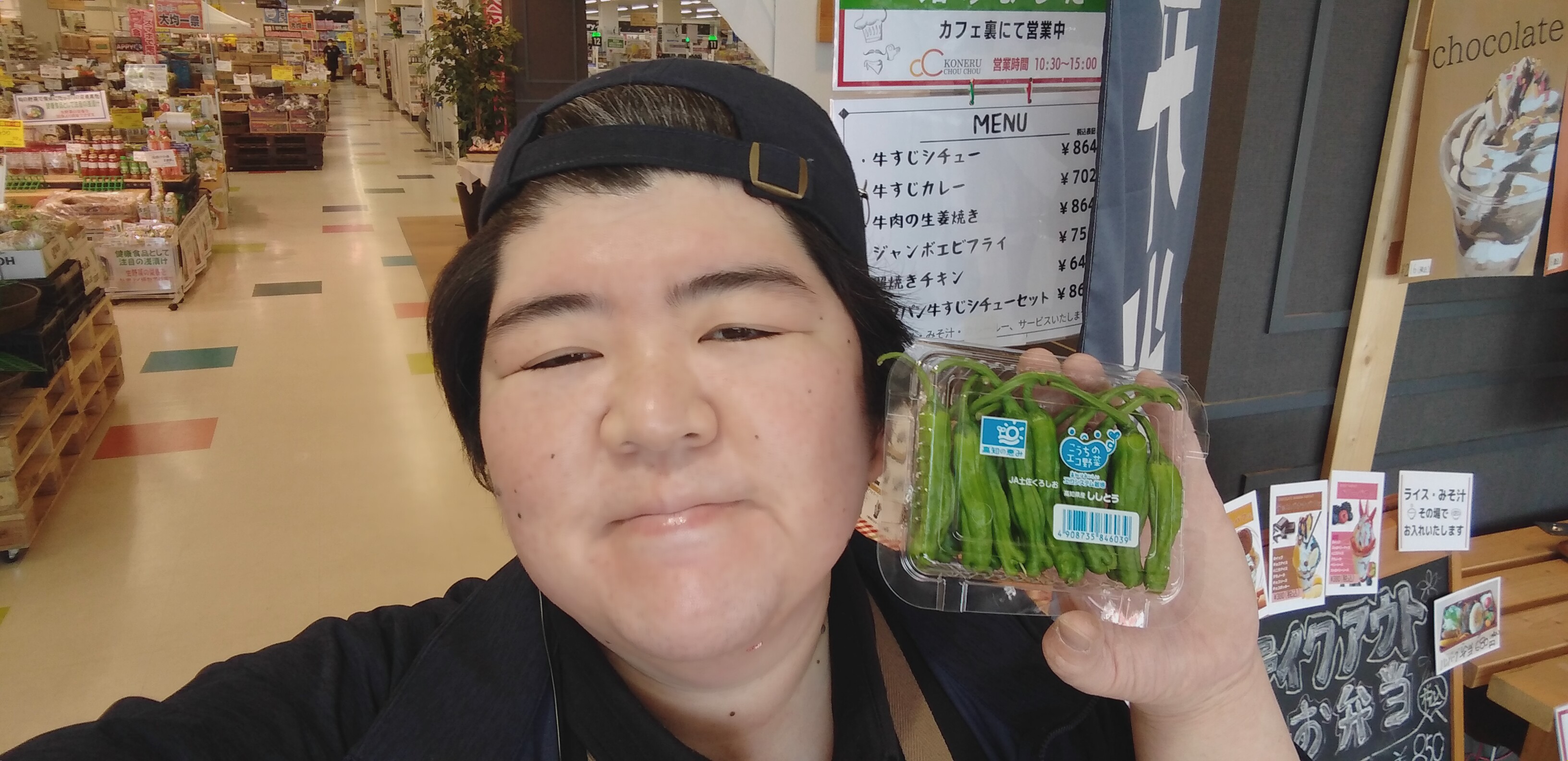 おはようございます。青果担当奥瀬です。青果担当奥瀬です。本日もスーパー大均一祭開催中。本日のオススメは、高知産のししとうです。1パック99円となっております。焼き物に揚げ物に炒め物に、ぜひご利用くださいませ。