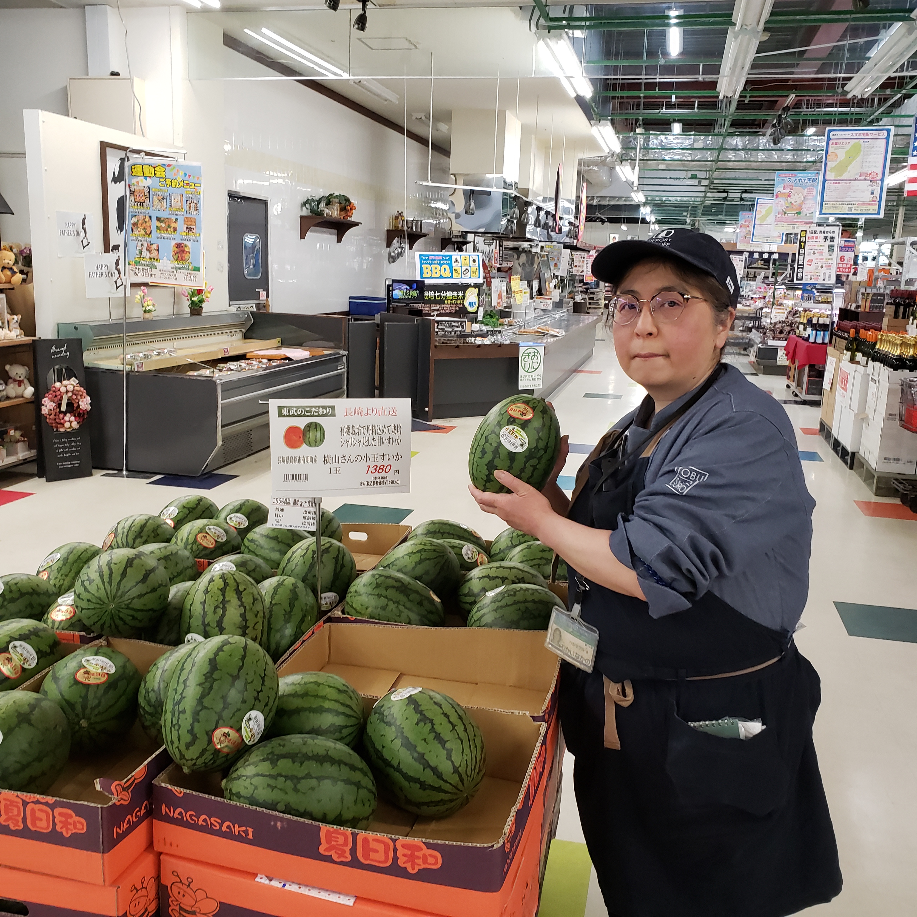 青果コーナーからは!東武のこだわり、長崎より直送! 有機栽培で丹精込めて栽培、 シャリシャリとした甘いすいかです!長崎県島原有明産 横山さんの小玉すいか 価格は1玉 1380円です。是非お買い求めくださいませ。