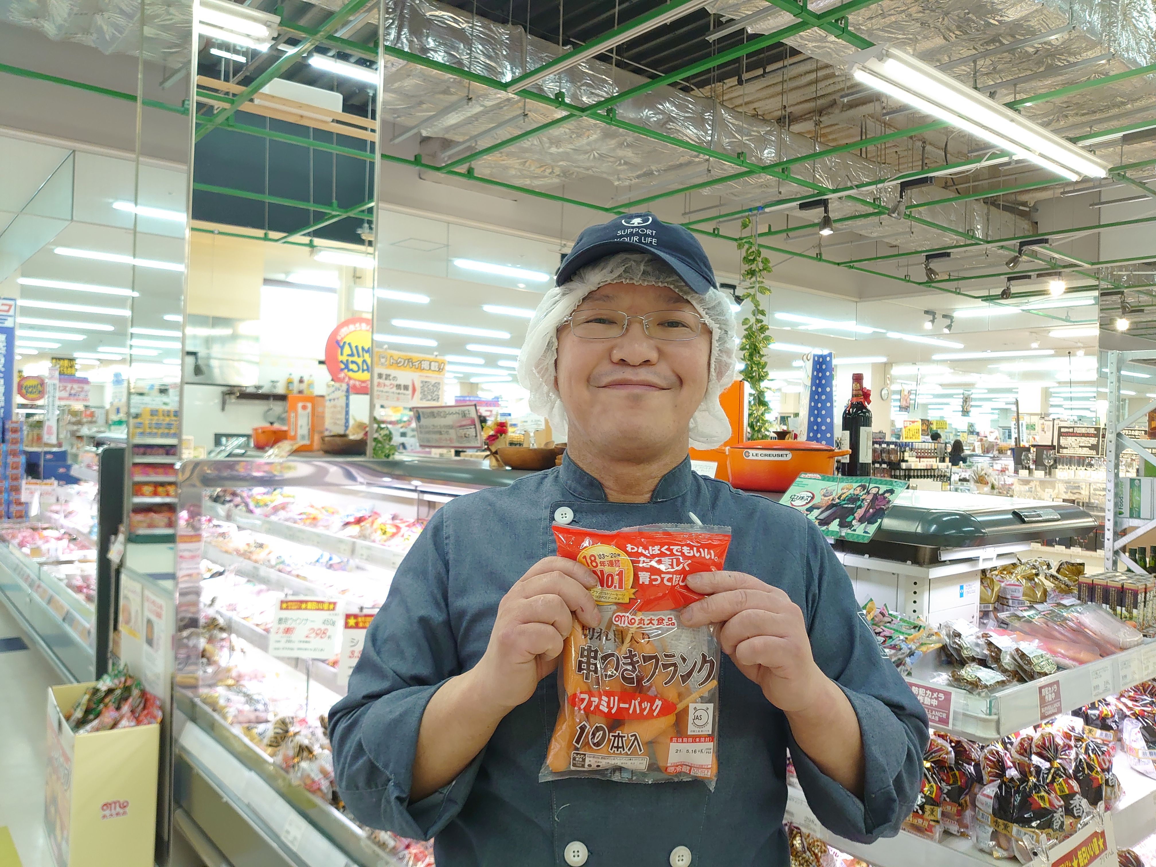 おはようございます。ミート担当近藤です。切れ目を入れ、串にさしたフランクフルトです。バーベキューや鉄板焼きにも便利にお使い頂けます。ファミリーやグループの集まりに最適な10本入りです。
