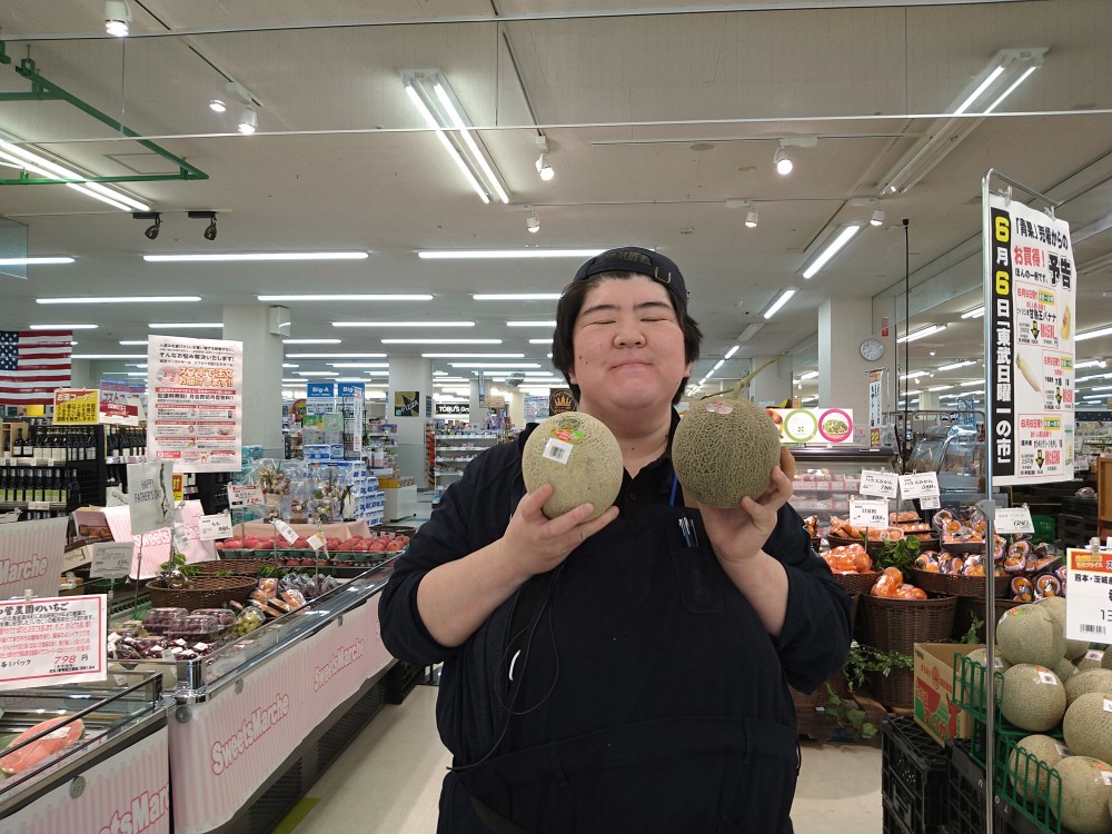 青果コーナーでは、赤肉・青肉メロンどちらも1玉¥770で販売しております。味の違いをお楽しみください。