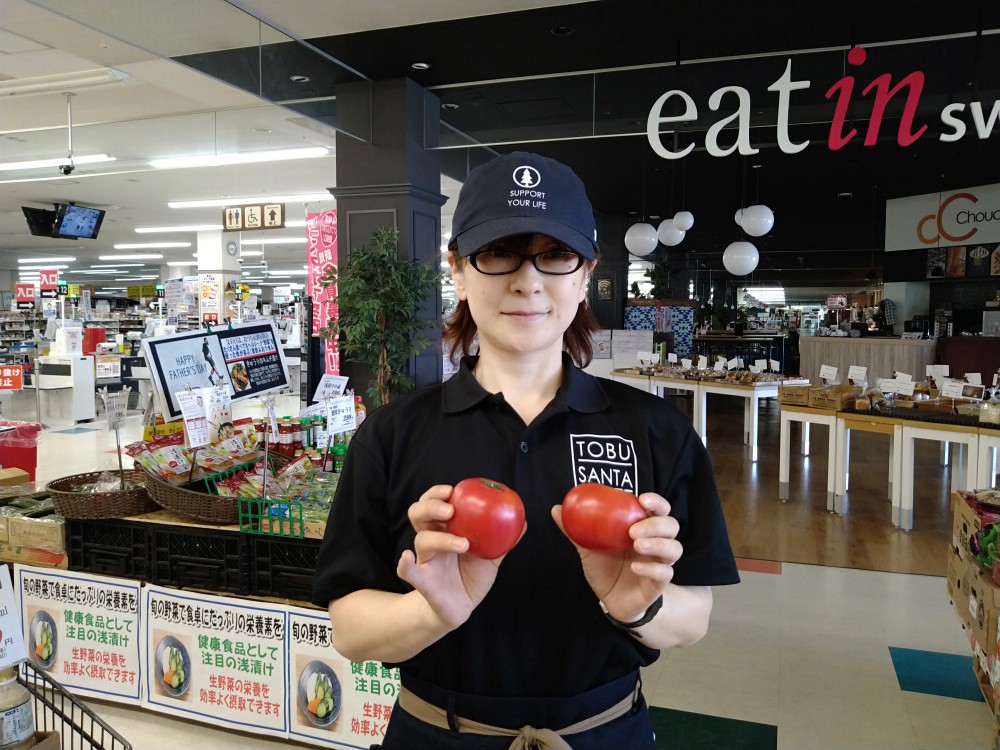 おはようございます。青果コーナーでは、北海道産の大玉とまとを1玉¥99で販売しております。生でも良し。加熱しても良し。どうぞ食べてください。