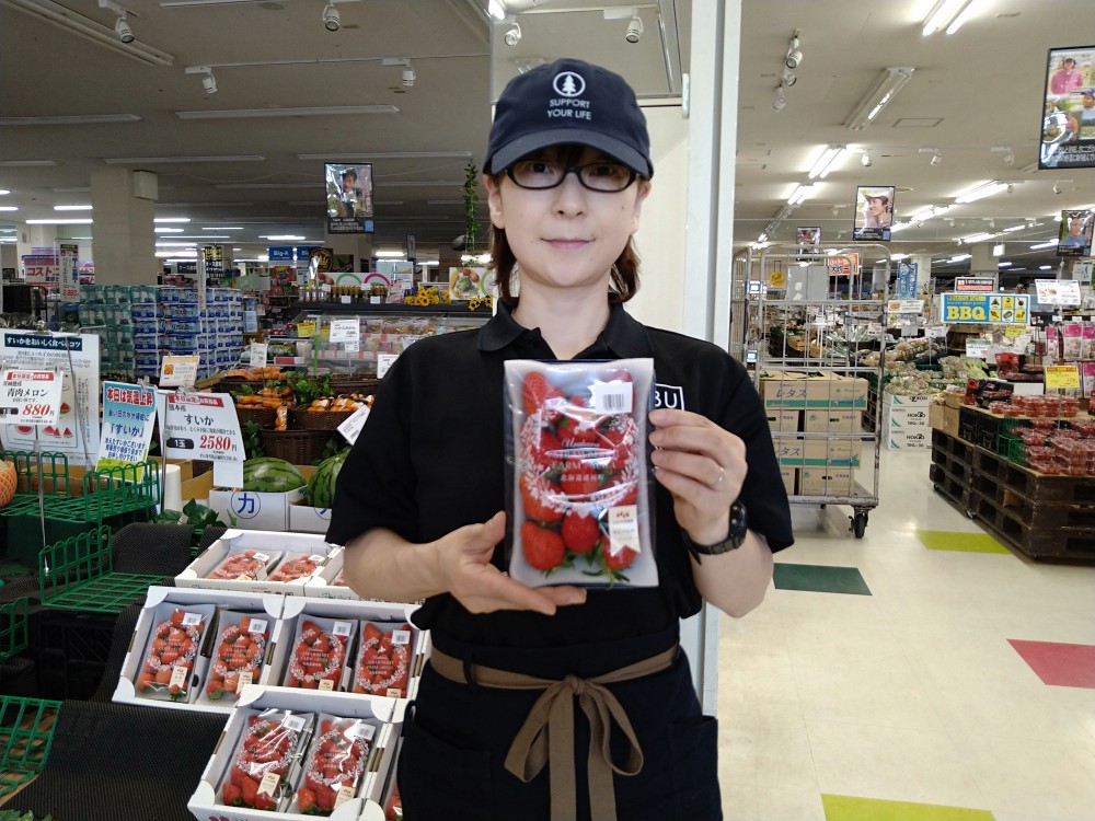 おはようございます。 青果コーナーでは、うらかわ菅農園のいちごが1パック¥798にて販売しております。 夏いちご生産量日本一の北海道浦河町で作りました。4種類のいちごがありますので、どうぞお召し上がり下さい。