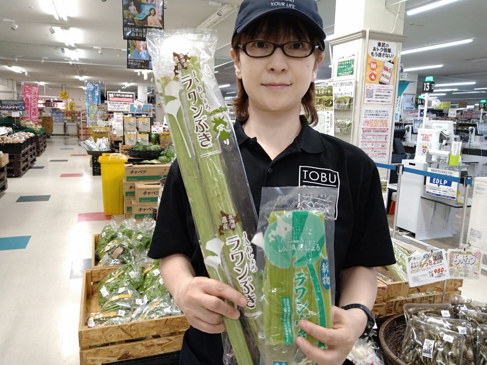 おはようございます。青果コーナーでは、足寄町のラワンぶきが入荷しました。足寄町に生息する日本一大きなフキが 水煮1袋¥258 生ぶき¥298で販売しております。どうぞ御賞味ください。
