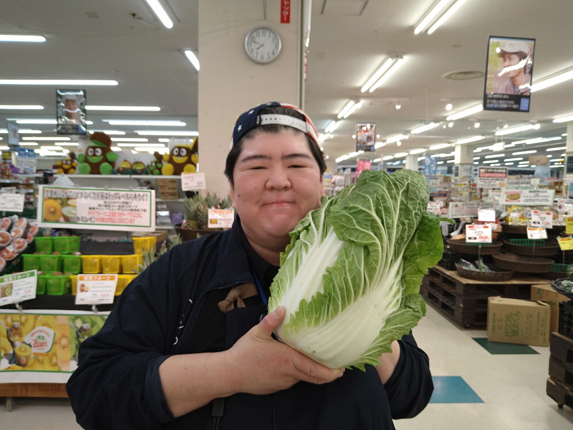 おはようございます。青果コーナーでは、北見産白菜1玉を¥198で販売しております。小ぶりですが、煮物、焼き物、湯がいてサラダに、どうぞご利用下さい。