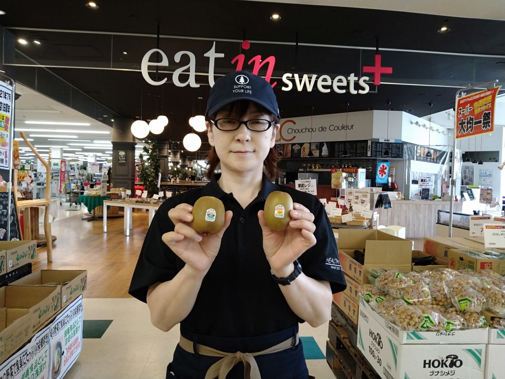 おはようございます。青果コーナーでは2種類のキウイフルーツが、各1玉¥99で販売しております。それぞれの味をお楽しみください。