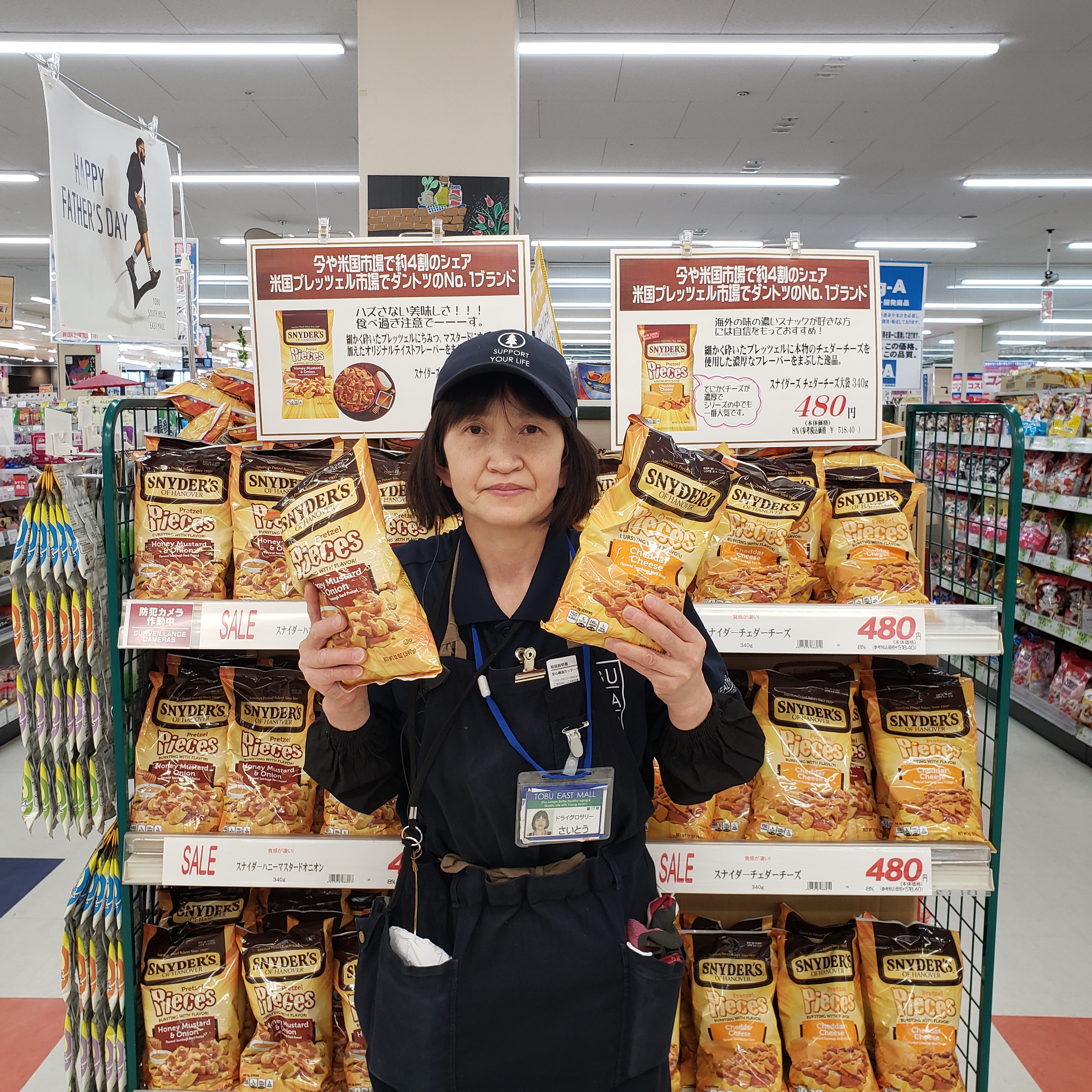 食品コーナーからは!おすすめ!とにかくチーズが濃厚です。細かく砕いたプレッツェルに本物のチェダーチーズを使用した濃厚なフレーバーをまぶした一品です!スナイダーズ チェダーチーズ 340g 入りで価格は480円です。是非お買い求めくださいませ。