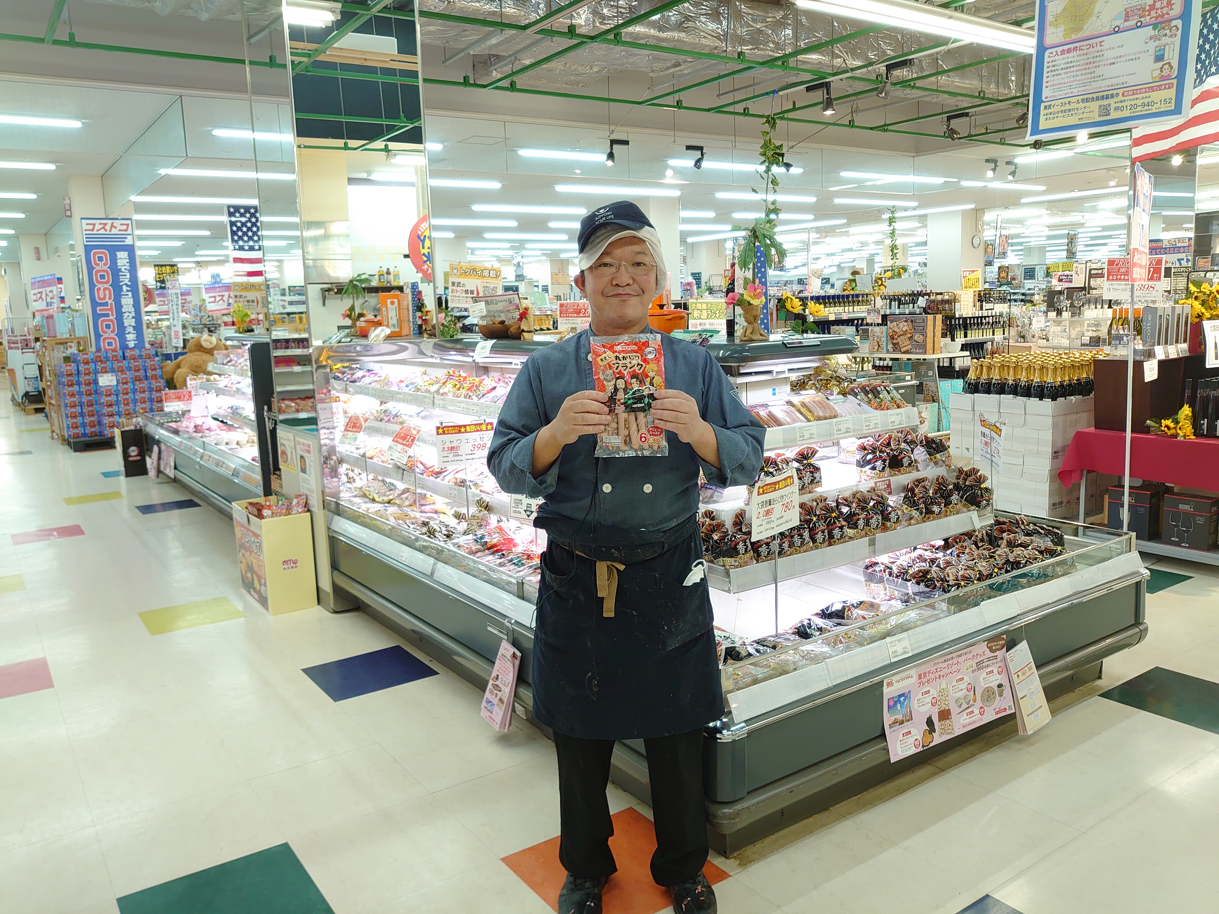 おはようございます。ミート担当近藤です。フランクフルトに、「鬼滅の刃」のキャラクターイラストがついています。串を持ったときにどちらからでもイラストが見えるように表と裏のキャラクターの向きを逆にしています。原料肉に豚肉を使用し、ホットプレート調理やバーベキューなどに最適な串刺しフランクです。