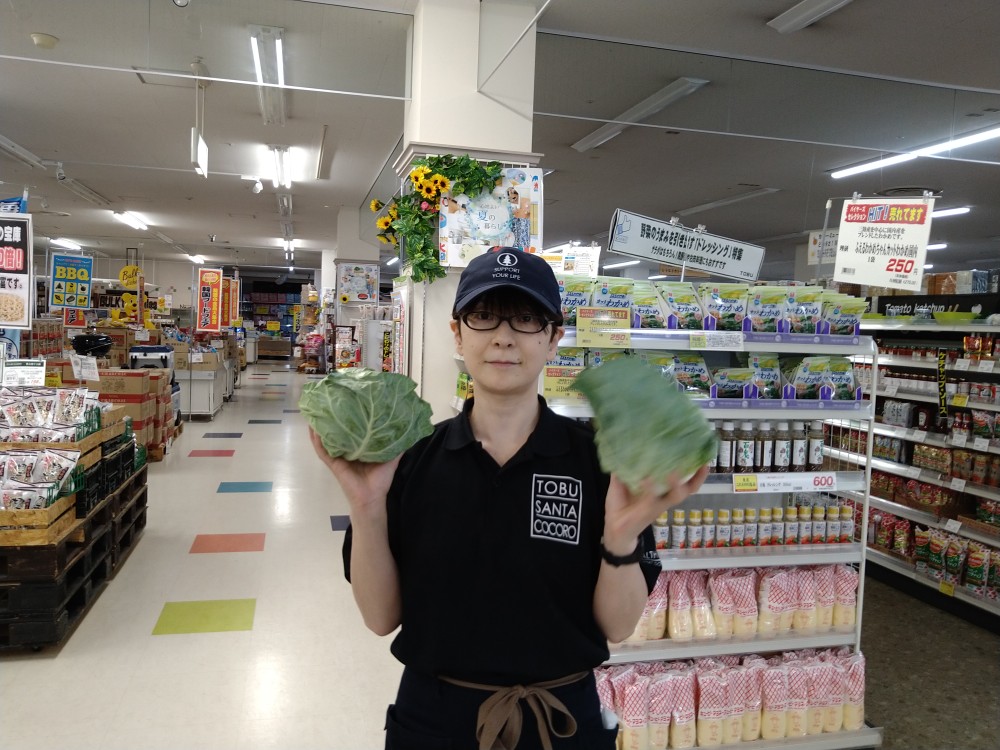 おはようございます。青果コーナーでは、北海道産きゃべつ1玉¥88で販売しております。 いつもより1サイズ小さく、使い切りサイズです。サラダやお好み焼きなど食べ方はいろいろありますので、どうぞ御賞味ください。