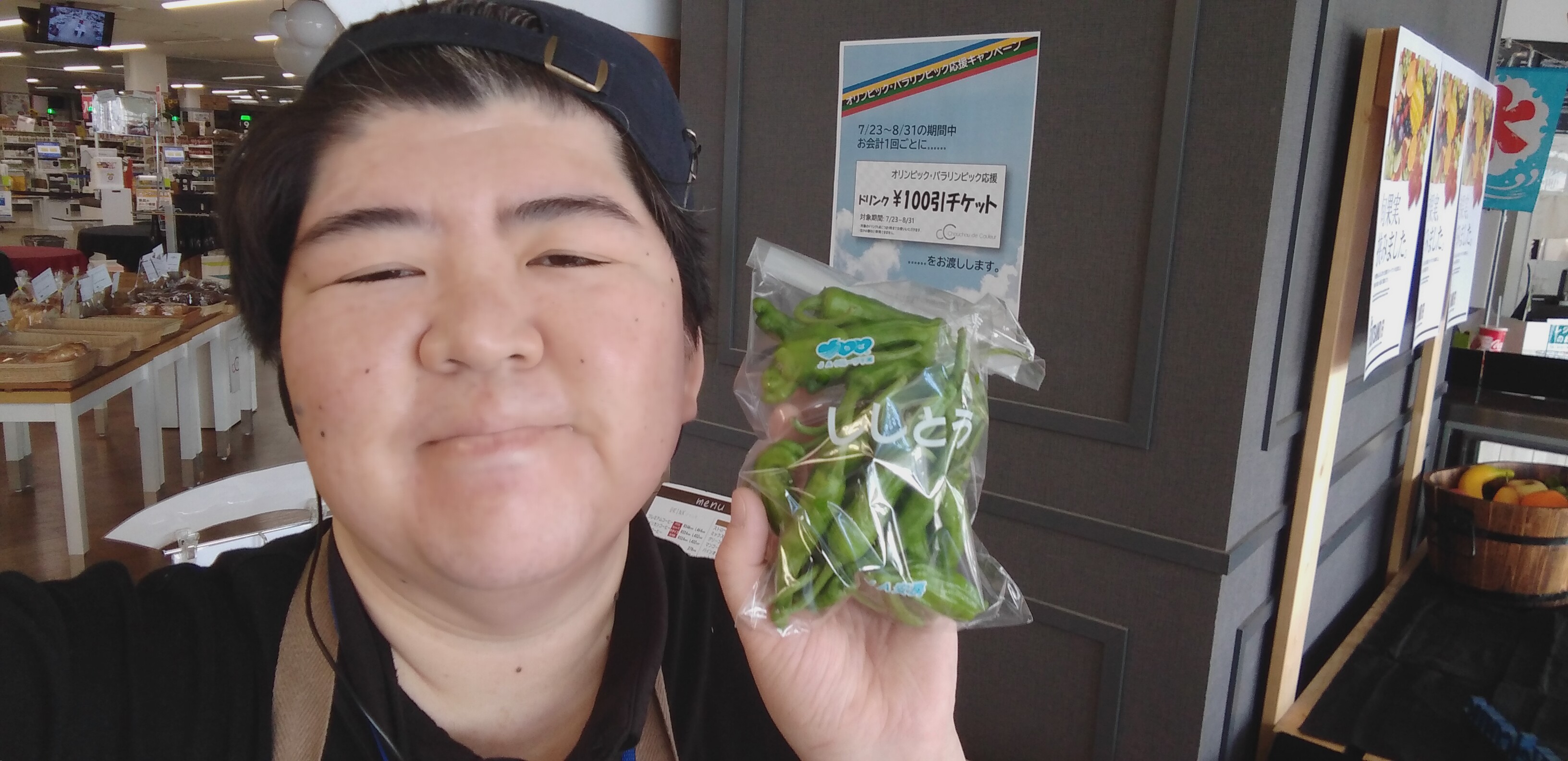 おはようございます。青果担当奥瀬です。本日よりスーパー大均一祭です。青果コーナーの本日のオススメは、千葉産のししとうです。1袋99円とお買い得です。焼き野菜に、揚げ物に、ぜひご利用くださいませ。皆様の御来店をお待ちしております!
