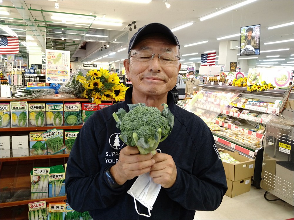 おはようございます。青果コーナーでは、北海道産 ブロッコリー1玉155円で販売しております。クルミやベーコンを合わせてサラダや、オリーブオイルでいためてつけあわせ等にいかがでしょうか?どうぞお召し上がりください。