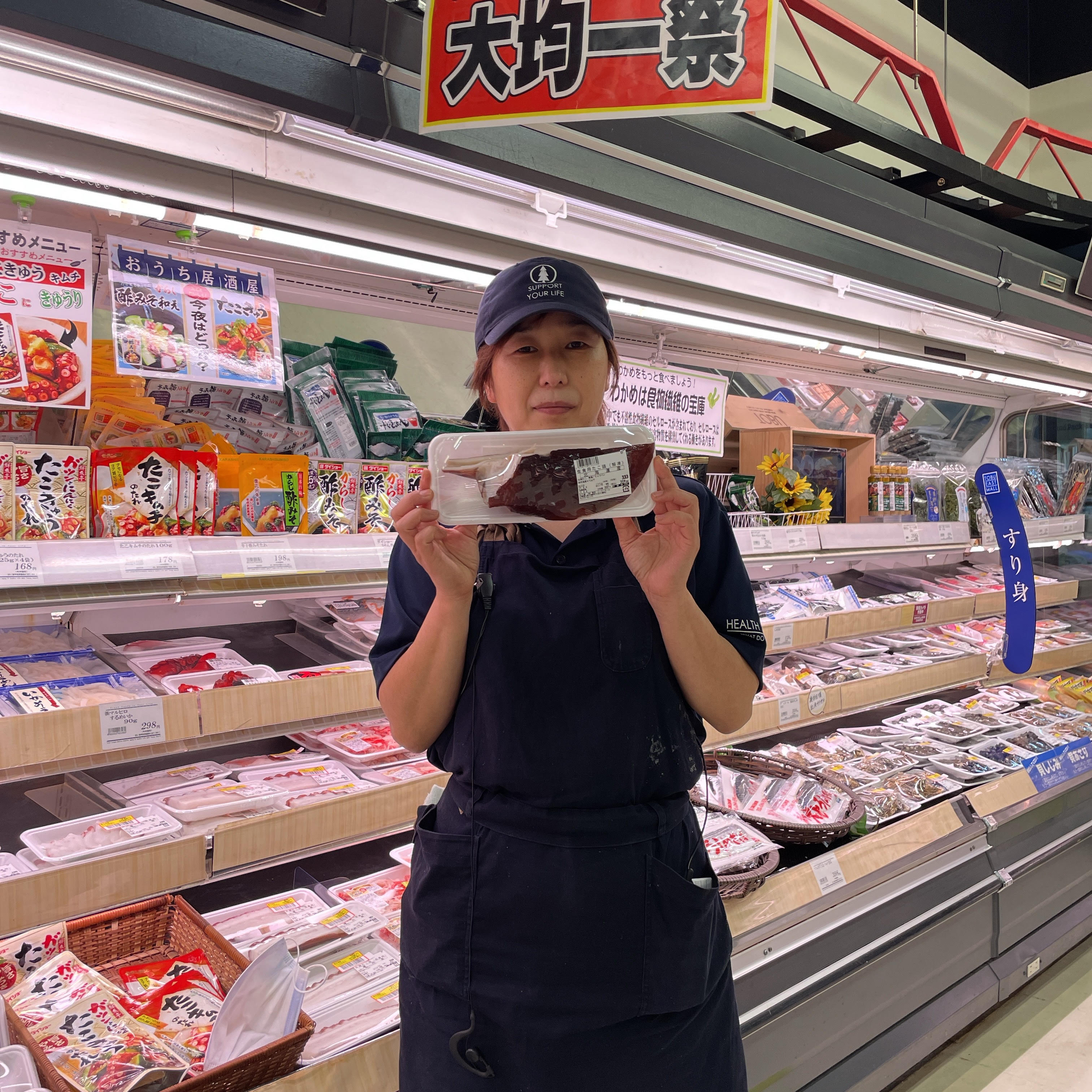 鮮魚コーナーからのお買い得品本日は北海道産たこ頭がお買い得です。100g99円(税抜き)で販売しております。本日も暑いのでさっぱりとカルパッチョ・キムチ和えなどにいかがでしょうか。