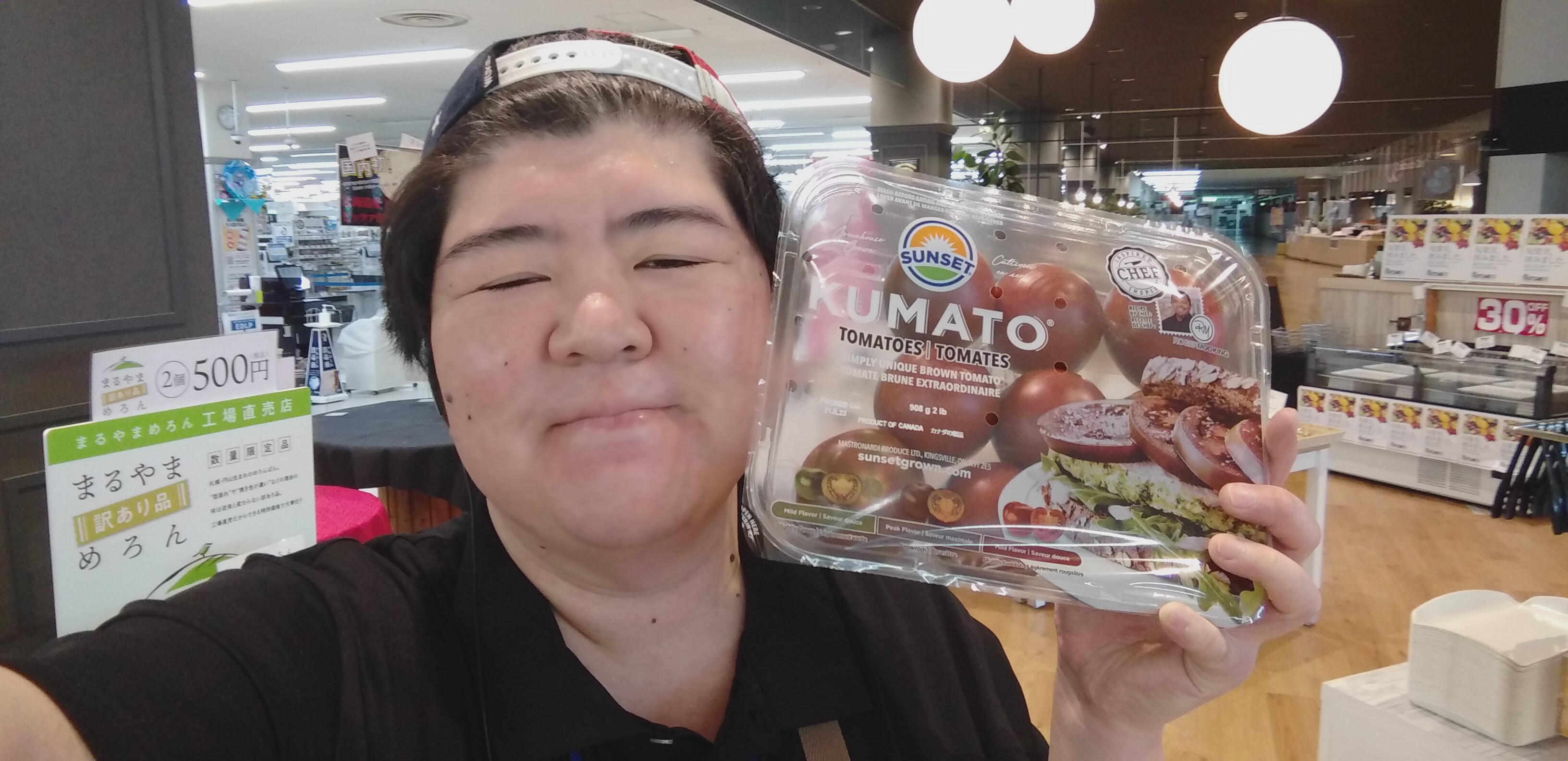 おはようございます。青果担当奥瀬です。本日は日曜一の市とコストコセールをダブルで開催中です。本日のオススメは、コストコのトマト「クマト」。色は暗いですが、クセが少なく、果肉が多めなので食べ応えもバッチリ。ぜひご賞味くださいませ。この他にもお買い得な商品を多数ご用意しております。皆様の御来店をお待ちしております!