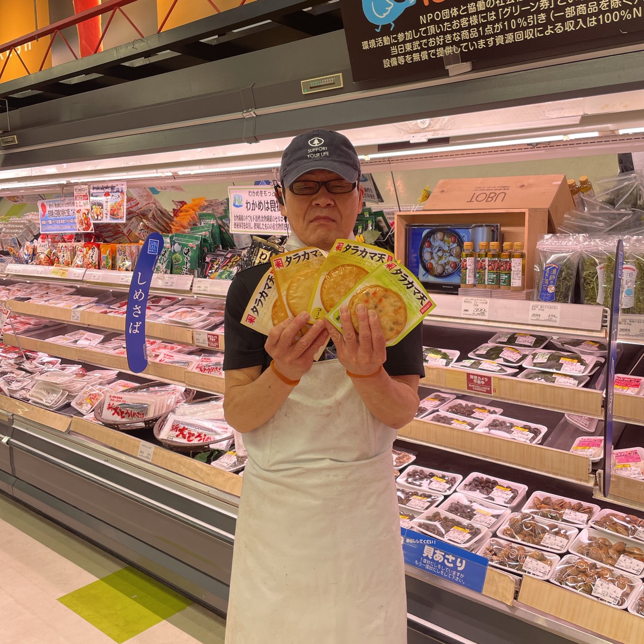 鮮魚コーナーからのお買い得品、 たらかま天1枚158円で販売しております。 プレーン、野菜、コーン、チーズの4種類あります!どれも食べ応えがあり、おいしいです。