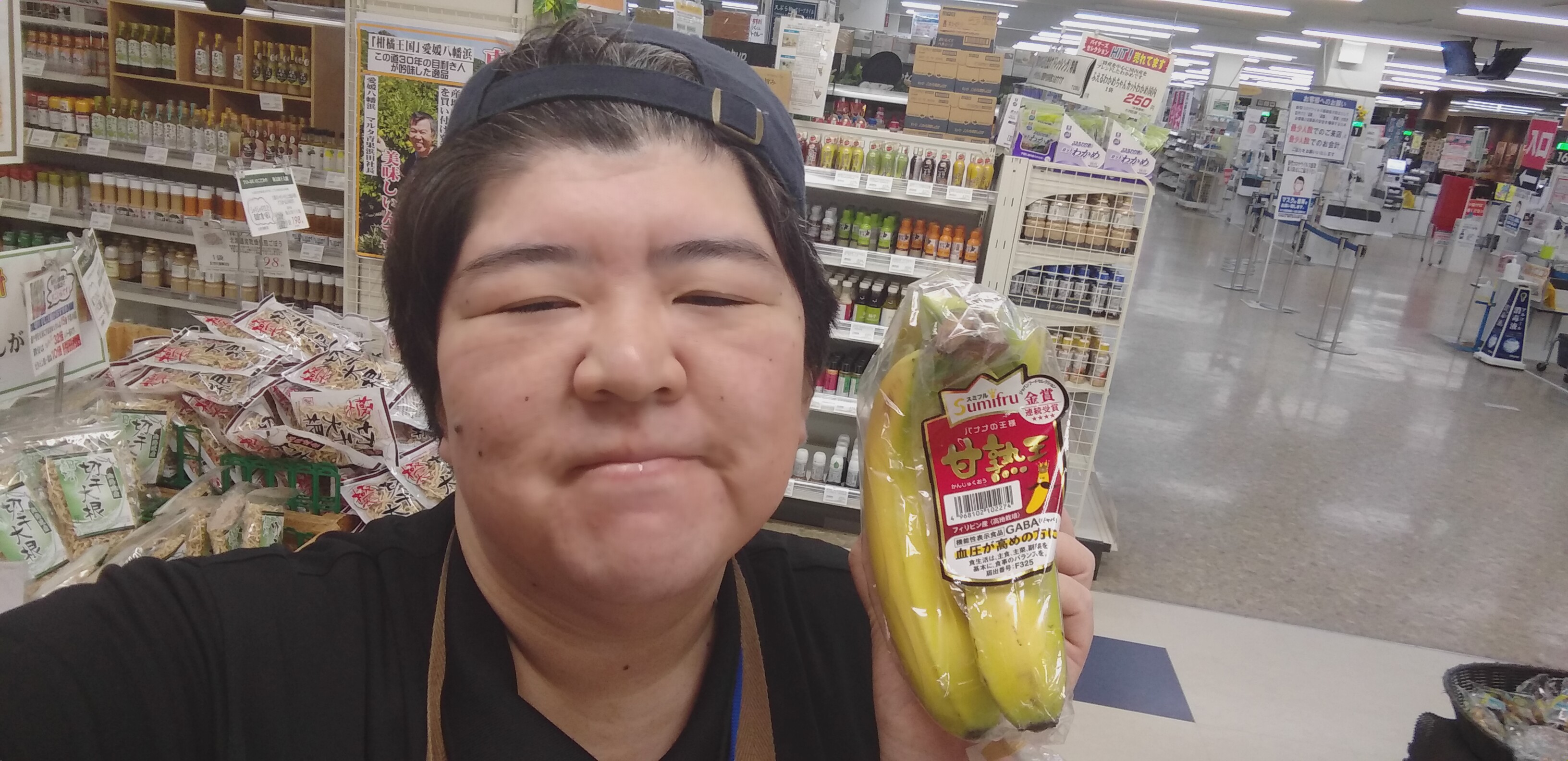 おはようございます。青果担当奥瀬です。本日のオススメは、フィリピン産の甘熟王バナナです。1袋195円となっております。夏休みのおやつにいかがでしょうか?ぜひご利用くださいませ。